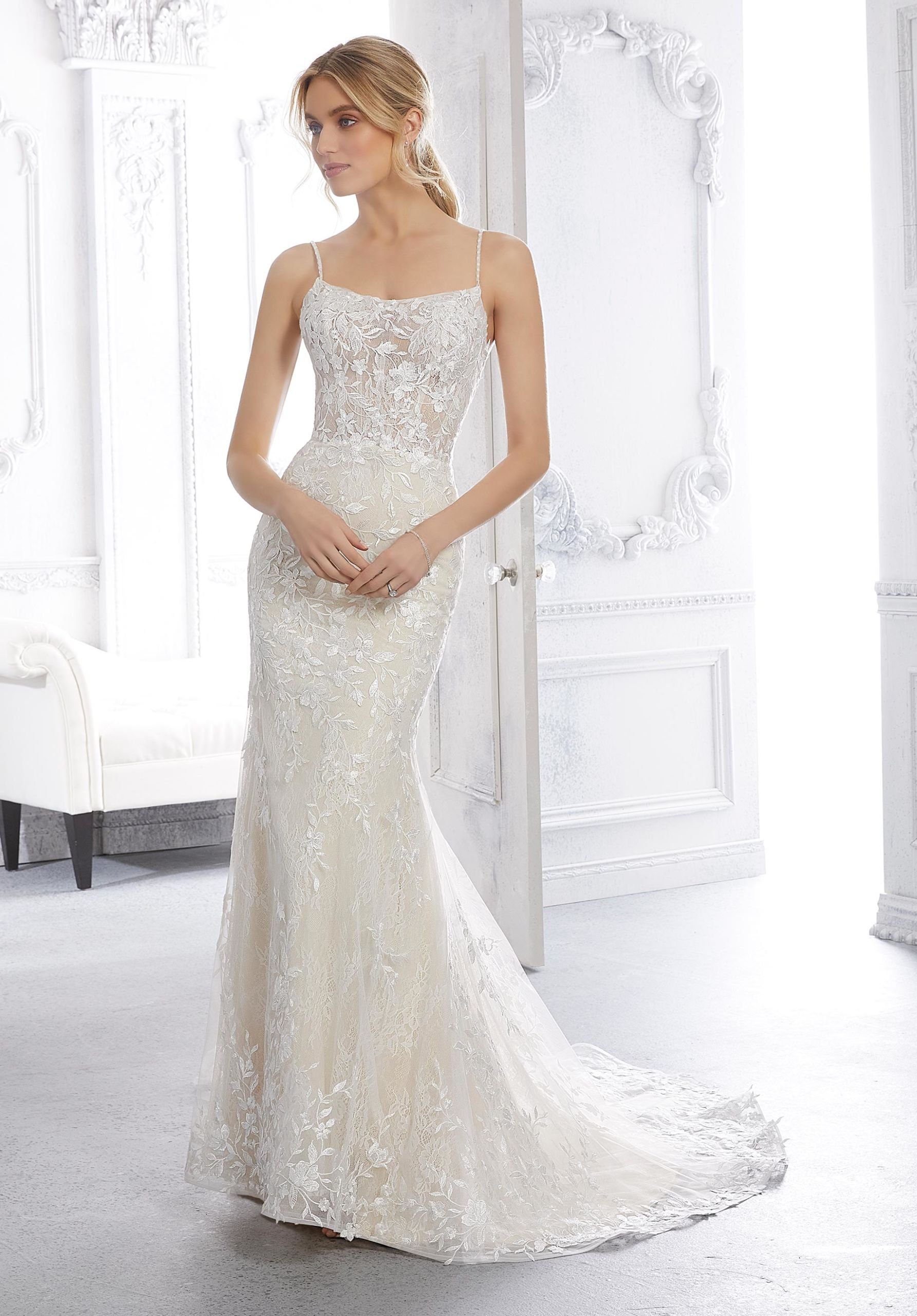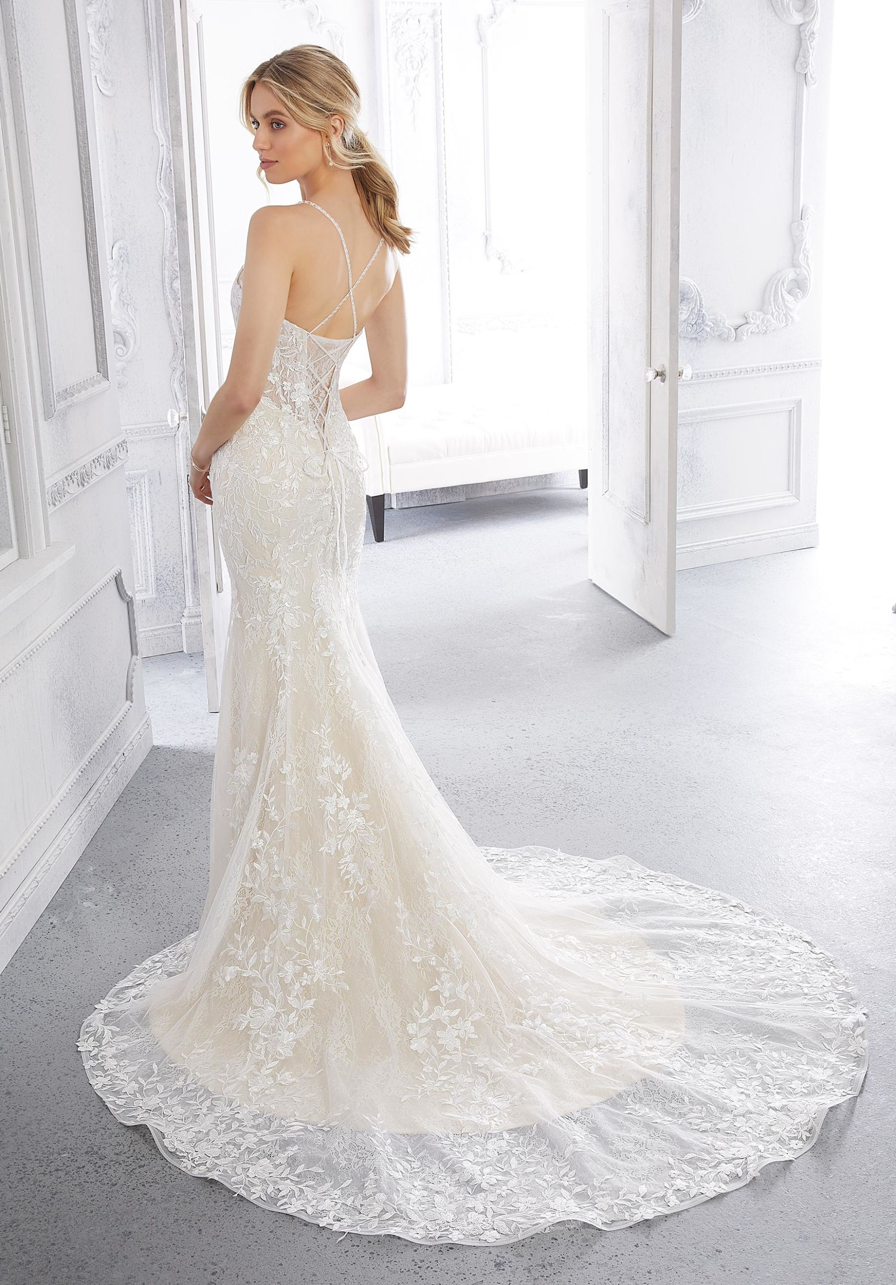 Glamorous fit and flare has allover frosted floral embroidery over romantic Chantilly lace with beaded straps and a lace-up corset back