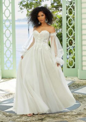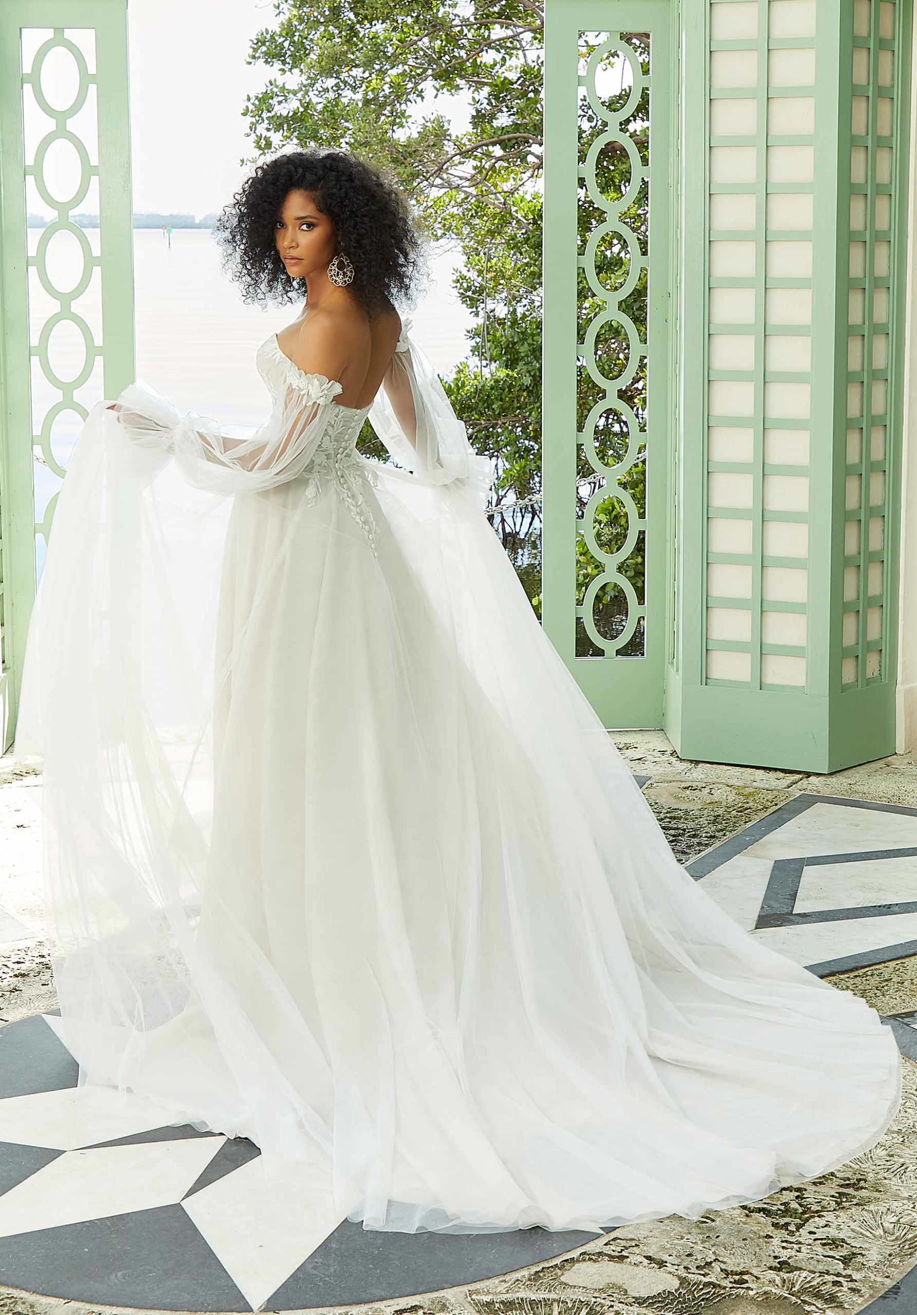 Airy and elegant, our Franzeta designer wedding dress has a whimsical flair. The flowy tulle A-line features a bustier bodice with draped detailing accented by frosted embroidered lace appliqués with delicate beading. Pair the dress with detachable long pouf sleeves for a fairytale touch.