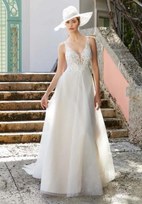 Our Fannie designer wedding dress is beautifully boho. The effortless A-line shines in sparkle tulle with frosted Alençon lace detailing on the v-neck bodice. The unique gathered effect in the front adds extra movement, but our favorite part is the breathtaking open back