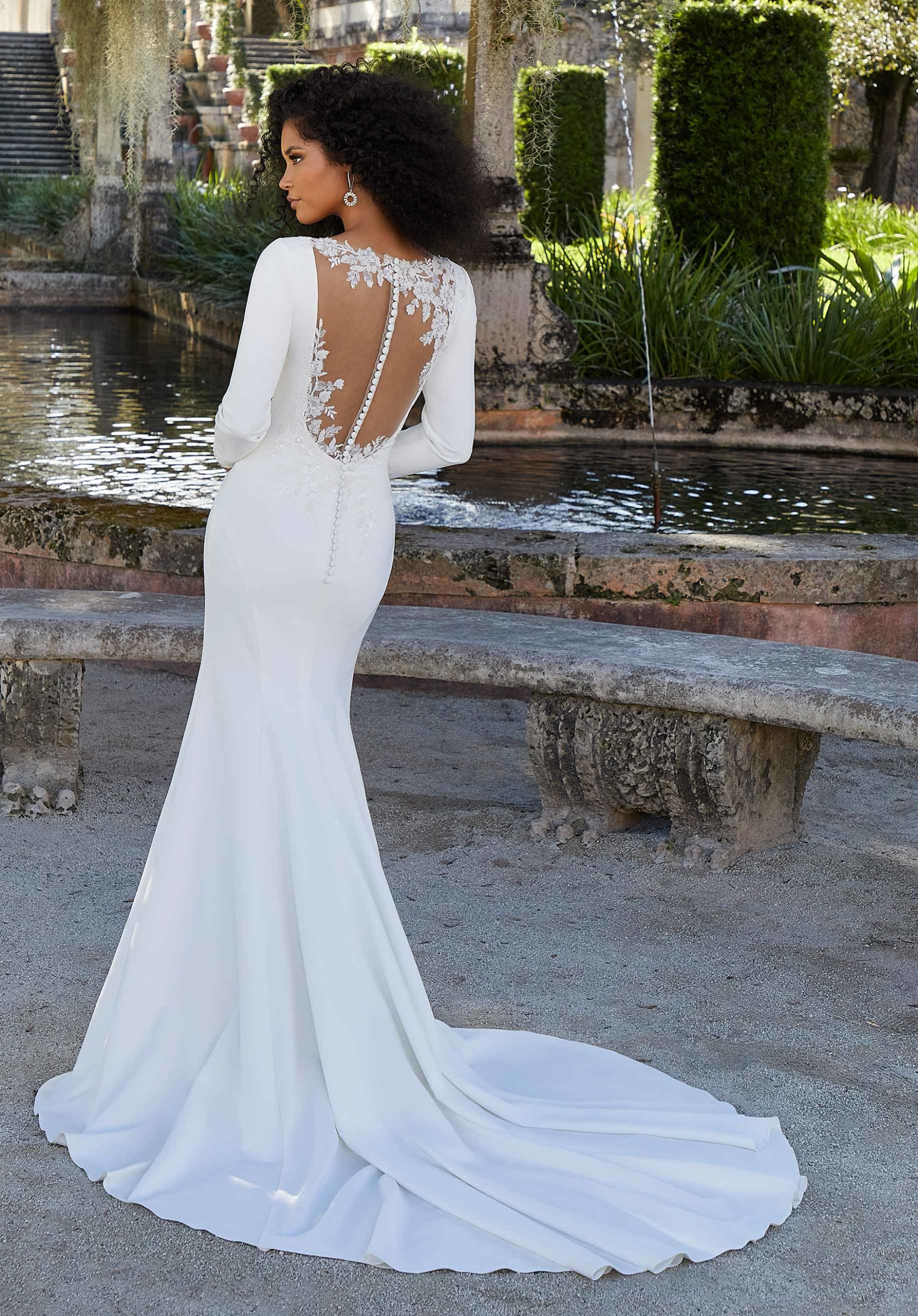 Sultry stretch crepe makes a simple yet stunning impact on our Fila designer wedding dress. The shapely fit and flare gown features a plunging sweetheart v-neckline balanced by modest long sleeves. Perfectly placed seams help to emphasize your curves, but the best part is the illusion back with Alençon lace appliqué trim.