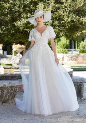 Our Fidelina dress is fresh, feminine, and flowy. The effortless A-line features a Chantilly lace bodice with a sculptured v-neckline trimmed in sparkling crystal beading. Flirty flutter sleeves create an enchanting effect and lead to a delicate scoop back. The soft tulle creates a cloud-like effect as it skims the body creating a dreamy look as you walk down the aisle.