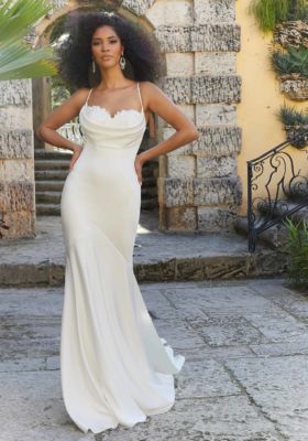 Our Frankie designer wedding dress serves fierce fashion with romantic bridal touches. The stretch satin fit and flare beautifully hugs the body, with subtle seams to emphasize your curves and a drop waist to elongate the torso. A unique cowl neckline pops with peek-a-boo embroidered appliqués creating a soft sweetheart neckline with delicate straps that lead to an open strappy back. Buttons lining down to the hem add a touch of tradition to this cool girl gown.