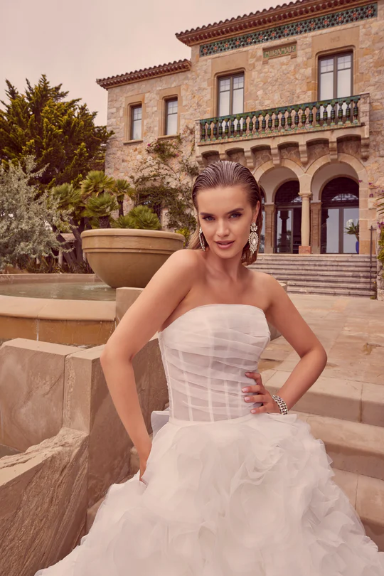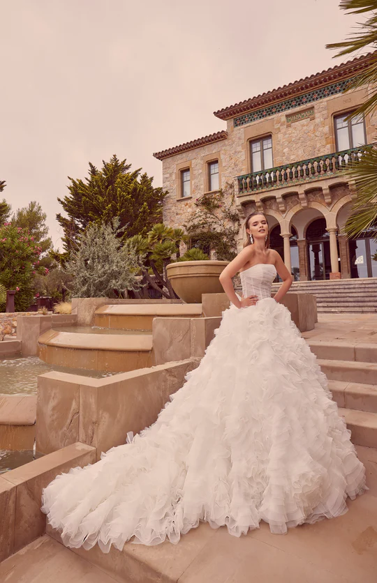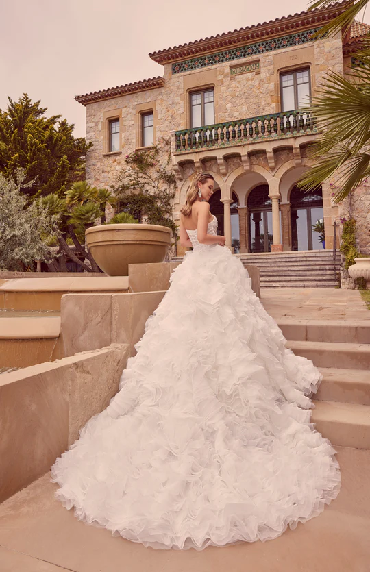 Drama and glamour can be found in this show-stopping designer wedding dress. The ball gown features a delicately pleated fitted bodice and ruffled tulle skirt, creating a fabulous texture with a subtle, swirling floral motif.