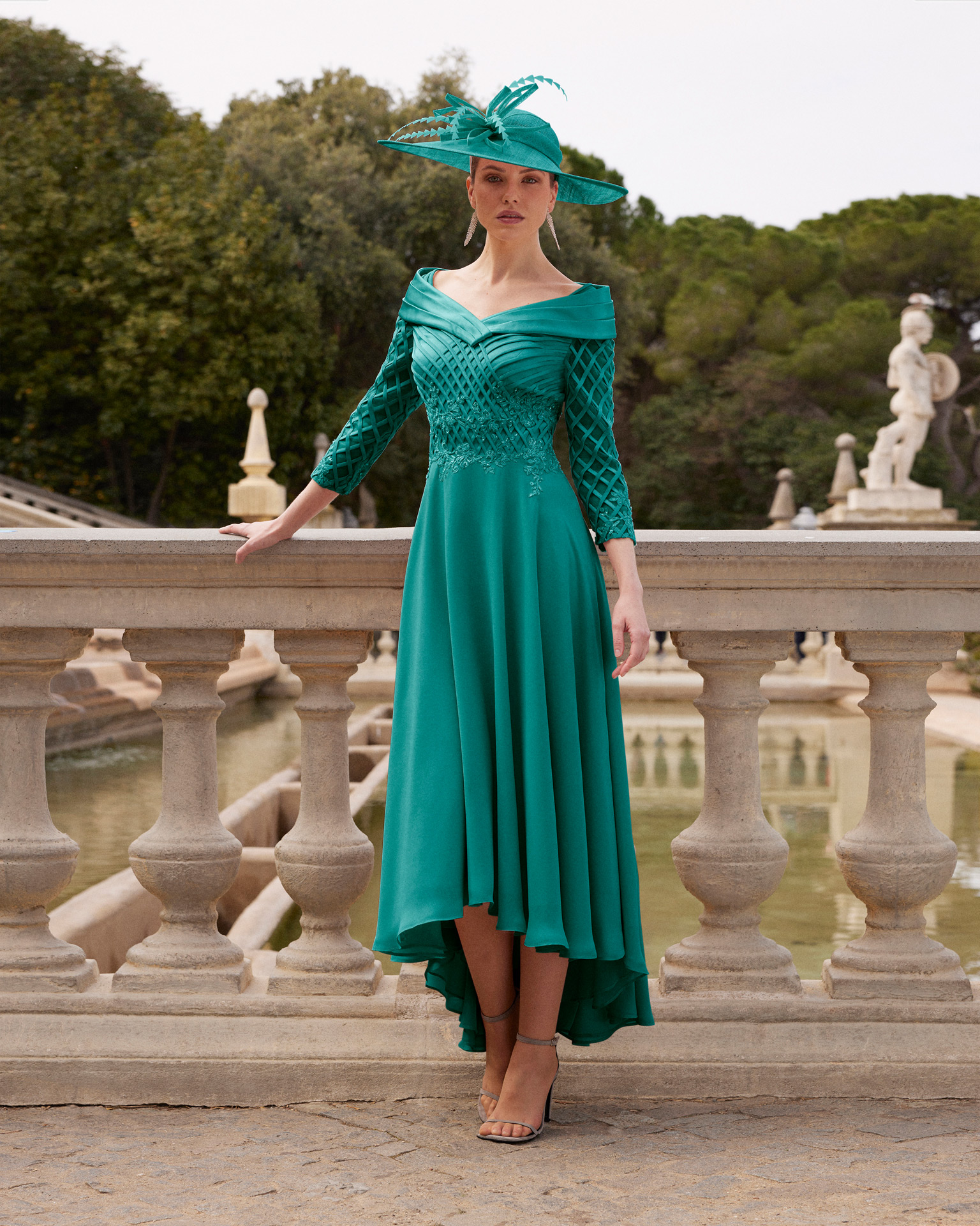7G184 is in a stunning Jade colour and is a beautiful high low dress for Mother of the Bride or Mother of the Groom. It features a long sleeve for coverage and a beautiful satin collar