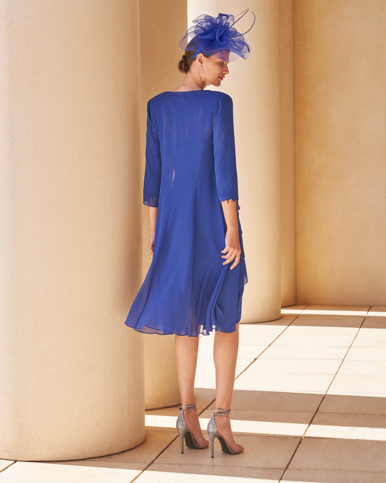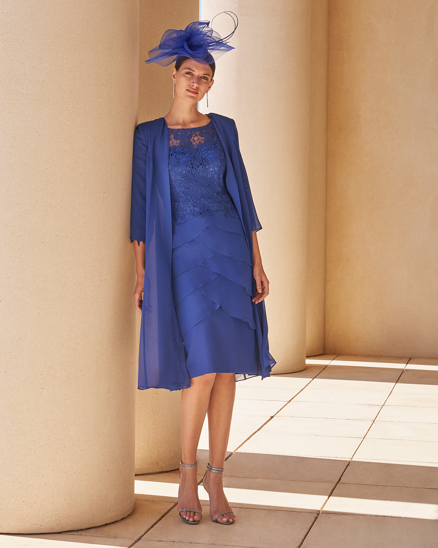 7G2E2 is a dress with a long sleeve and a chiffon coat over it. Its a perfect combination for Mother of the Bride or Mother of the Groom. The layers on the skirt are great at covering a tummy area and the long lace sleeve means you can remove the coat when the party starts