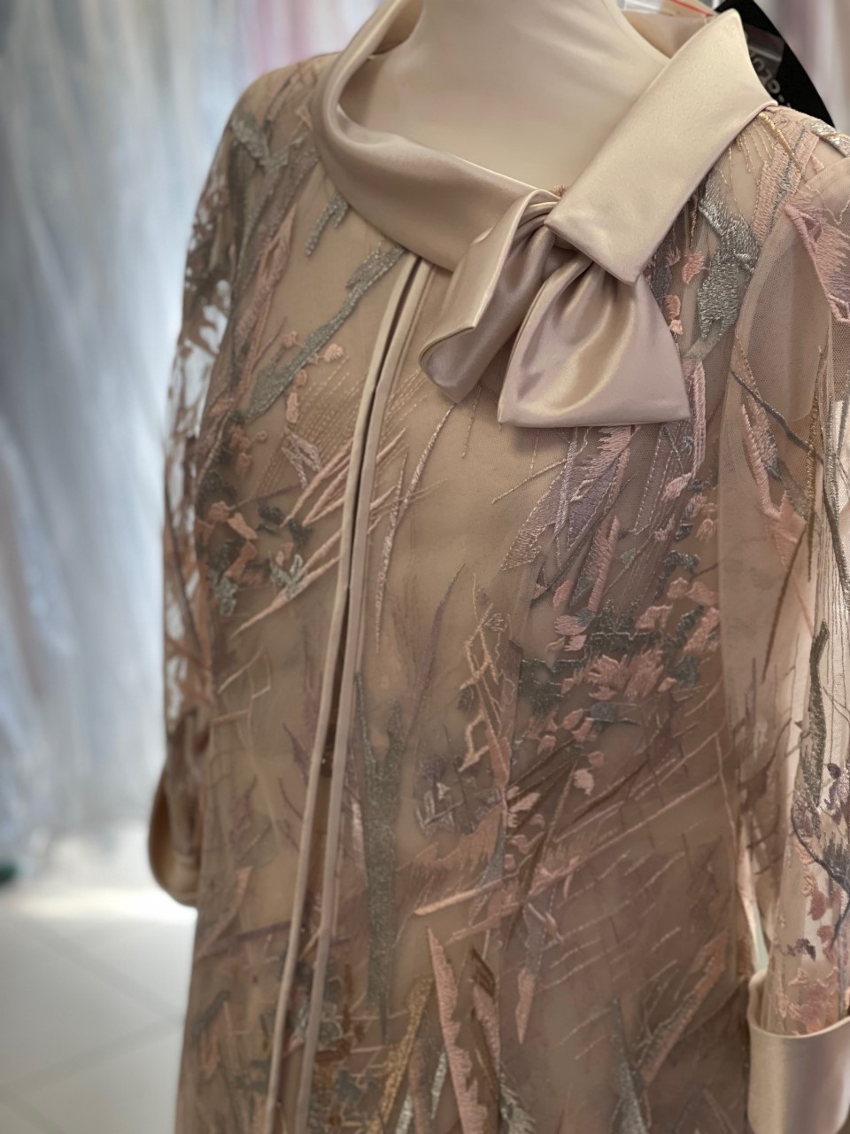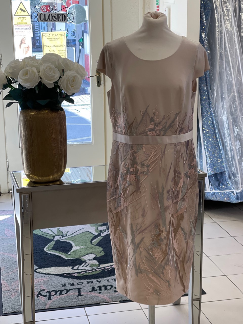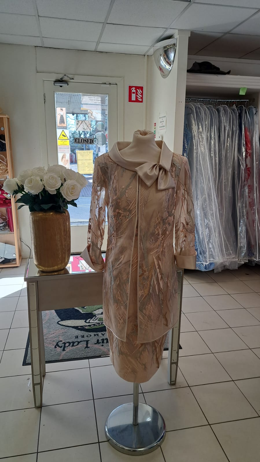 A beautiful dress and coat from Couture Club. The dress has an overlay of embriodery to match the coat and a round neck with a short sleeve. The coat is light and sheer and has a satin neck with bow detail
