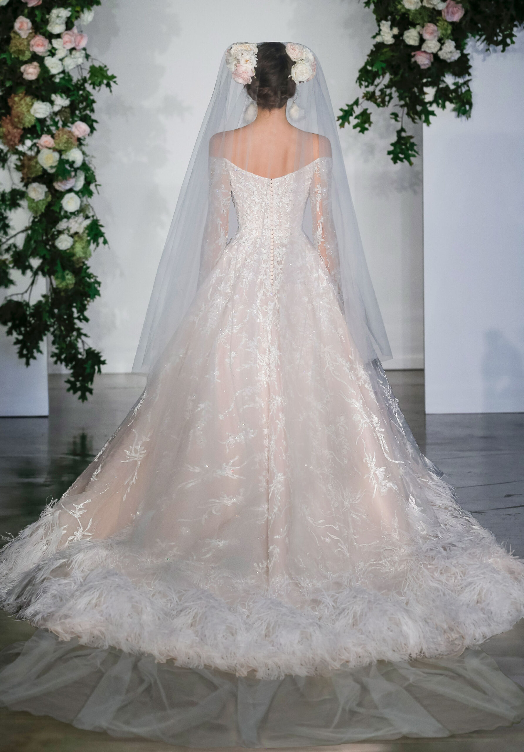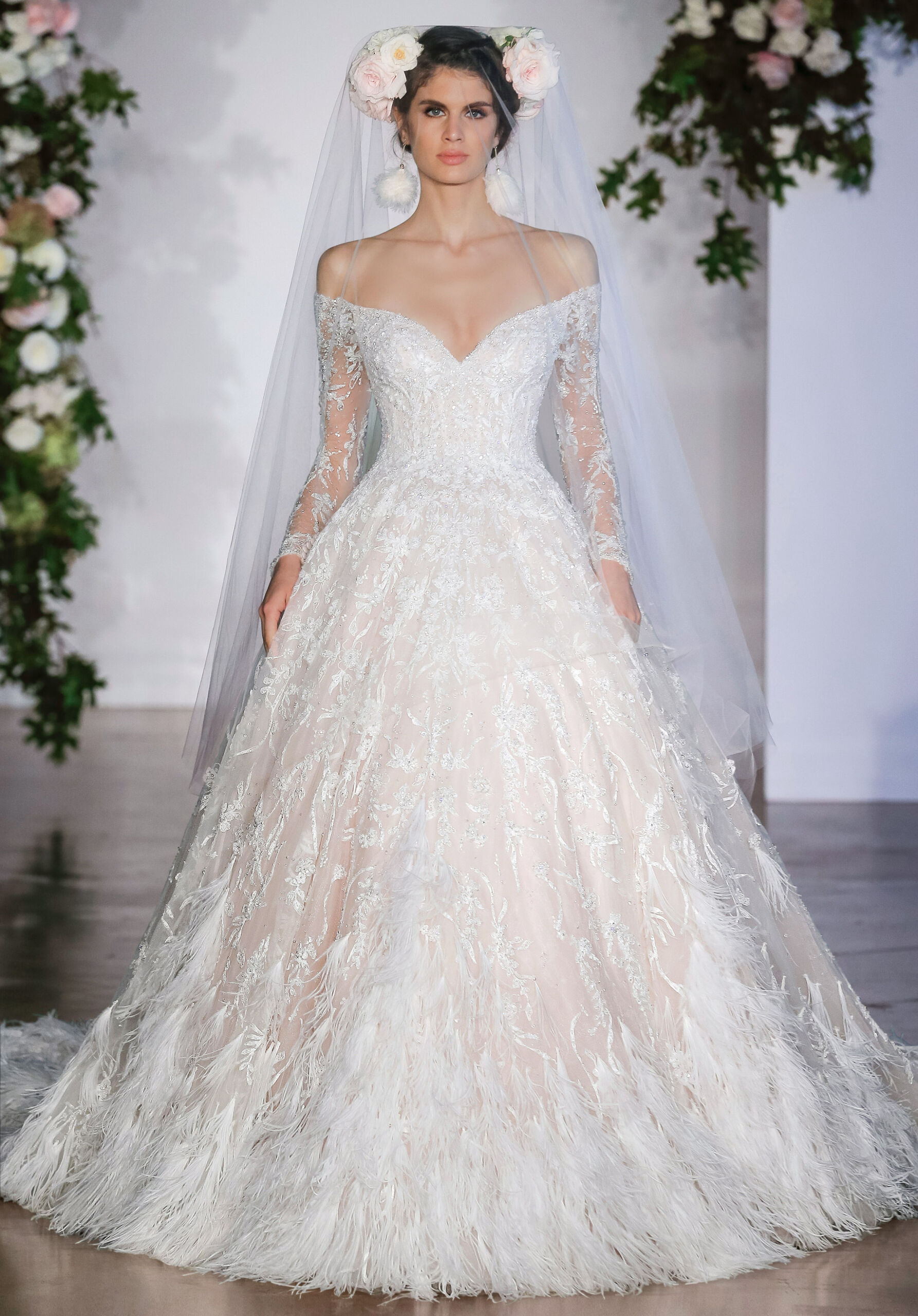 Home / Wedding Dresses / Morilee Wedding Dresses / Main Collection Wedding Dresses / 8226 KristabelleThis stunning fitted long sleeve Kristabelle designer wedding dress features beautiful beaded accents and textured embroidery on an intricately designed bridal gown. Available in ivory and ivory/nude, the plunging off-the-shoulder neckline complements the tulle ball gown silhouette of this designer wedding dress. A cathedral length train and hemline surrounded by a waterfall of feathers completes the look