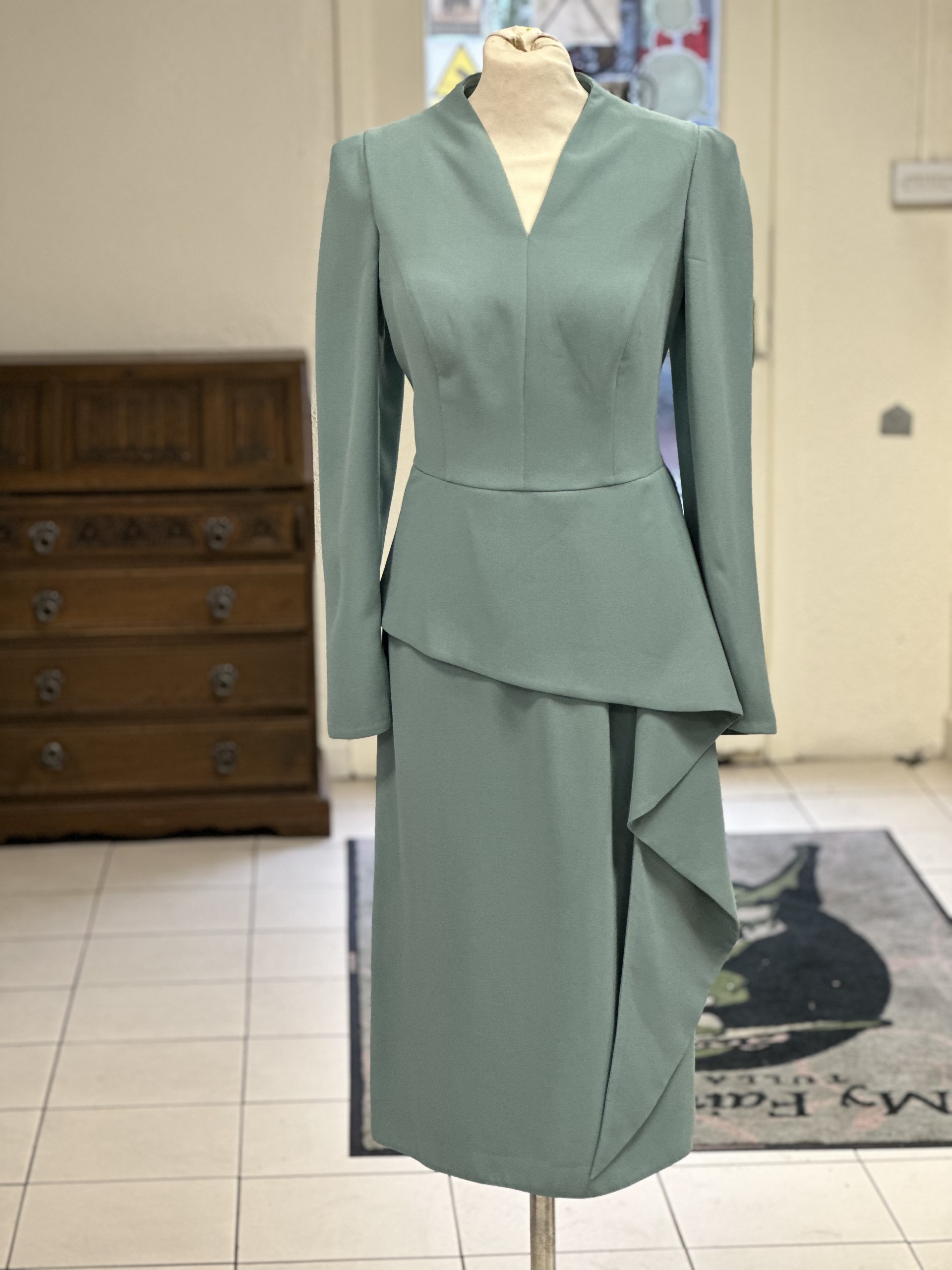 A beautifully cut dress in a perfect sage green. This dress has a peplum to hide a tummy and a nice drape of fabric down the front. With a high neck at the back and a small V its perfect for a more modest Mother of the Bride or groom.
