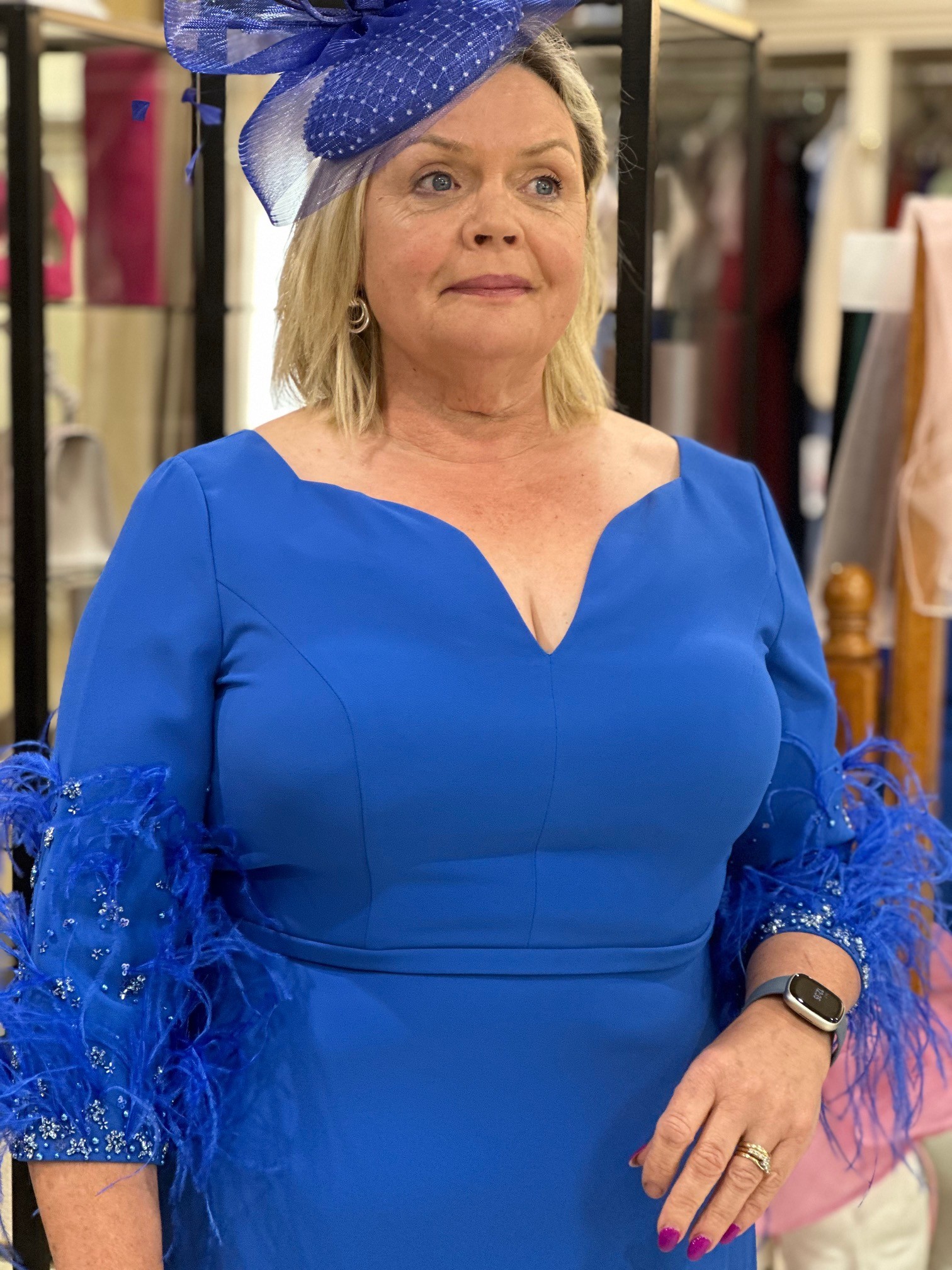 This fitted dress has an unusual v-neck design and features feather sleeves.