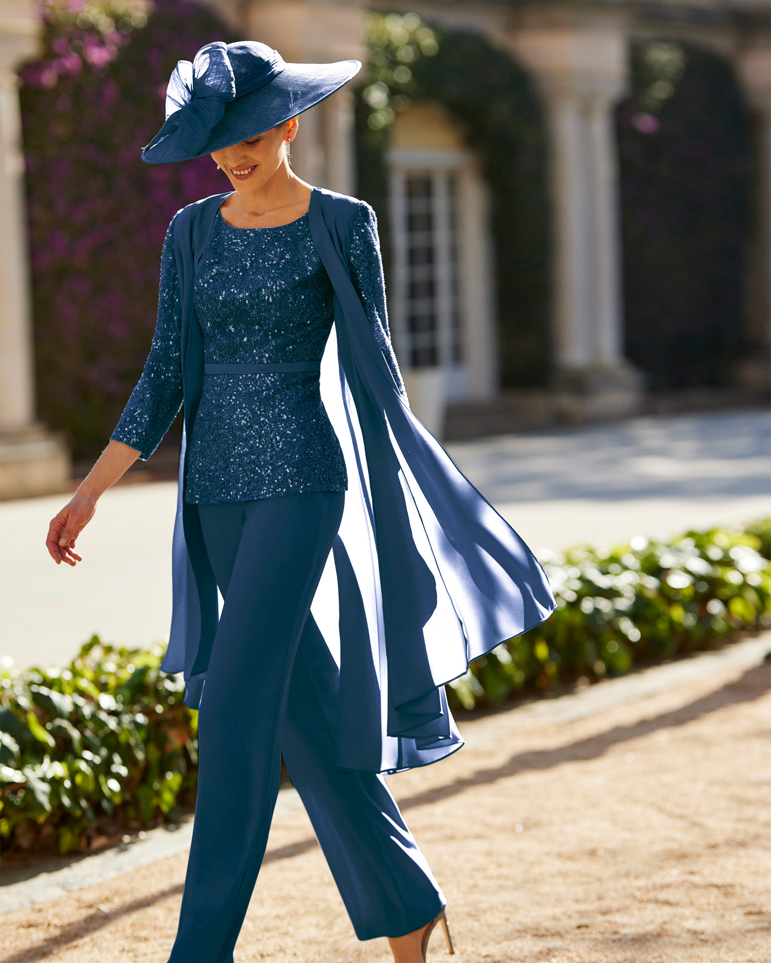 8G312 is a three piece trousers suit in navy. Featuring a fitted sparkling bodice and a chiffon coat with sparkly sleeves and a flowy chiffon trousers, this is sure to turn heads. Perfect for a Mother of the Bride or a Mother of the Groom that wants a trousers suit rather than a dress