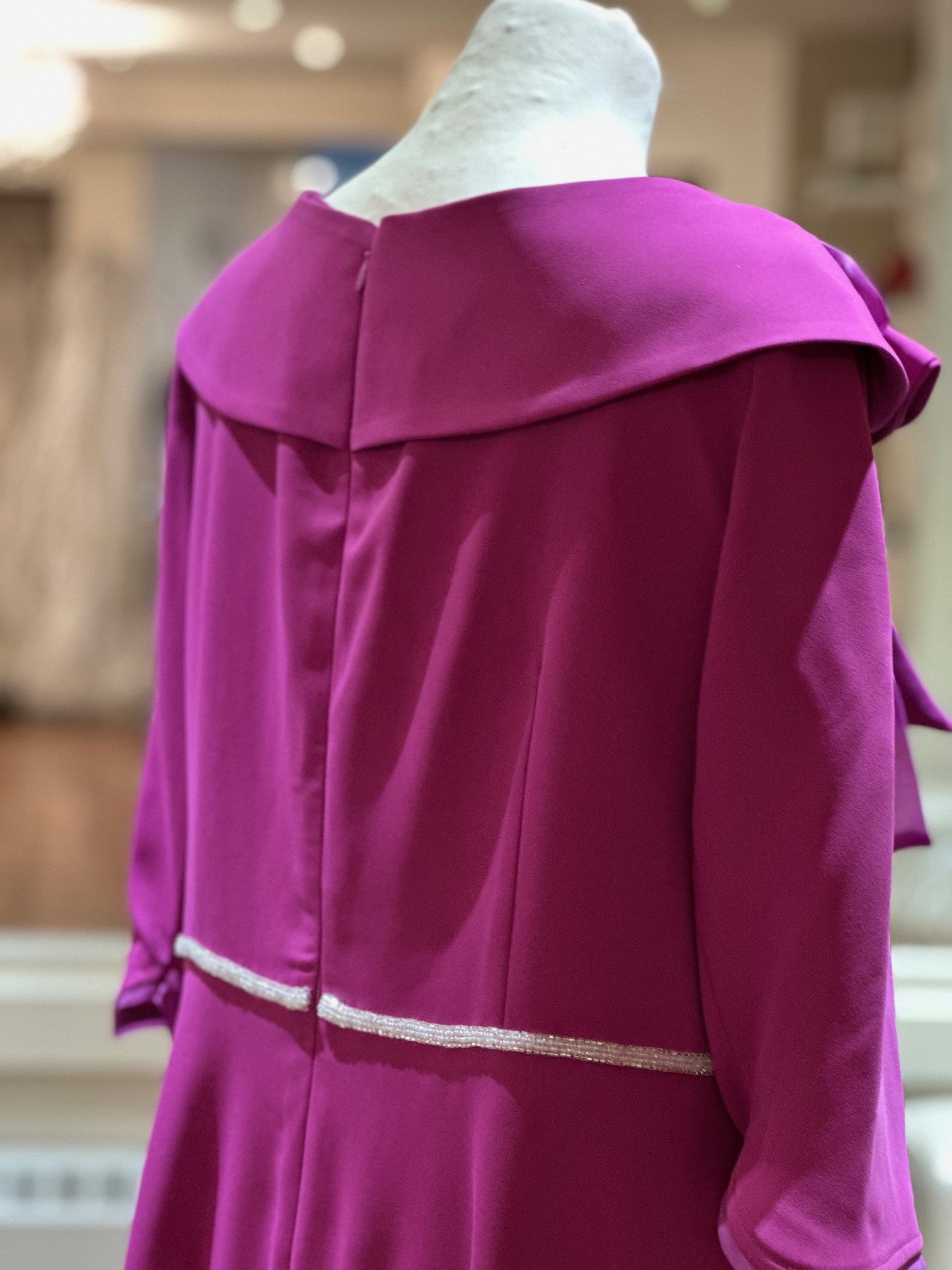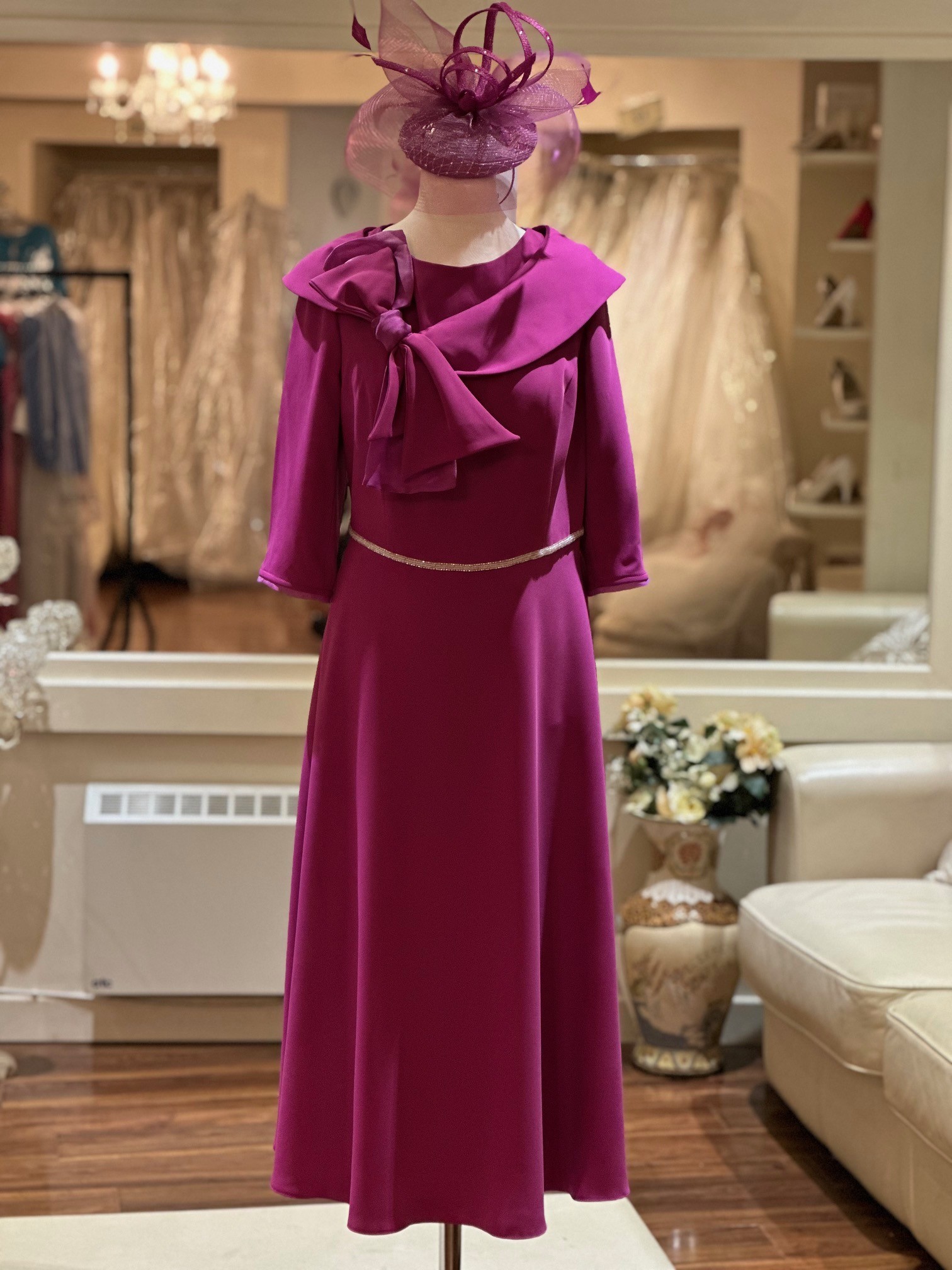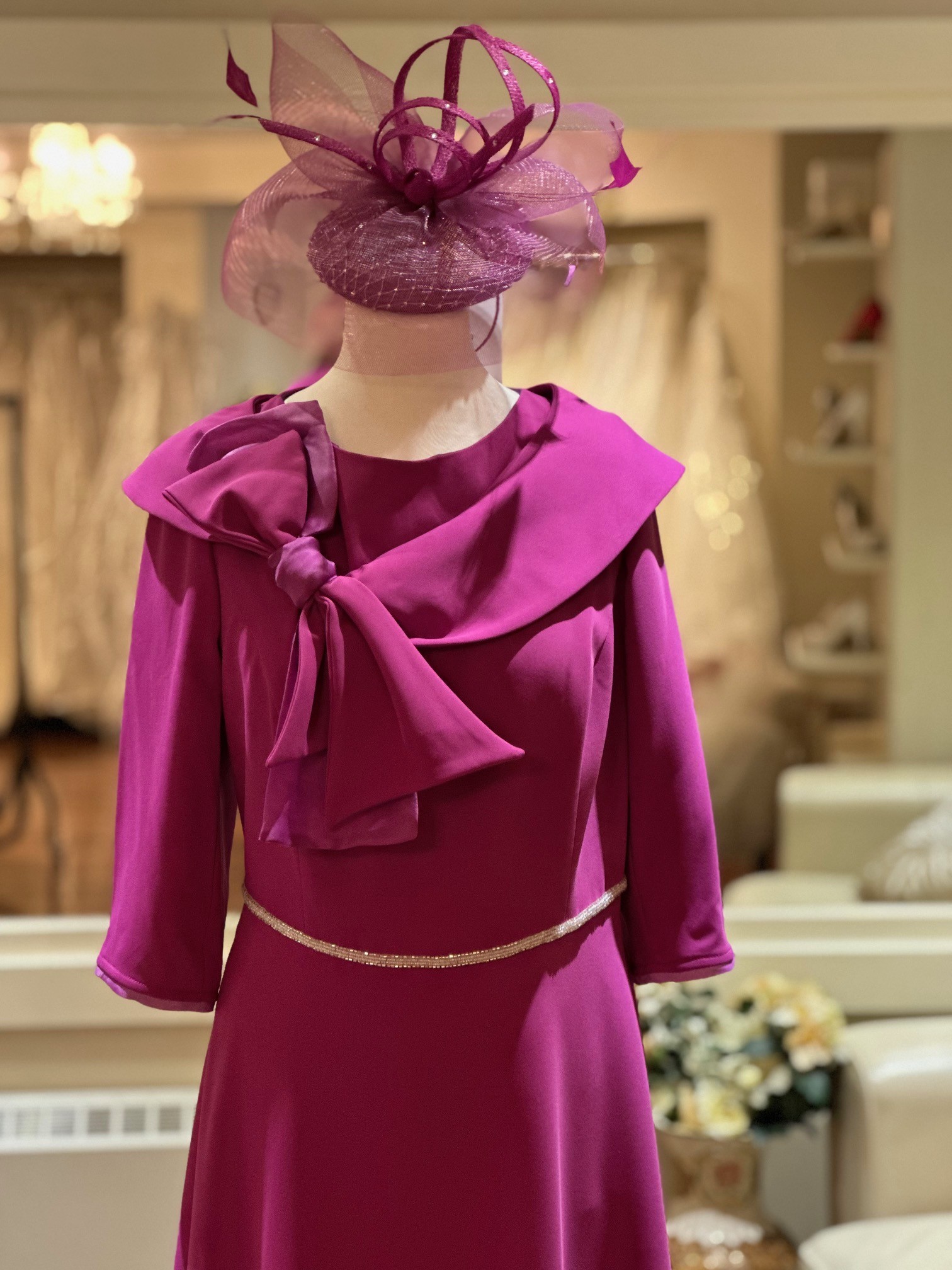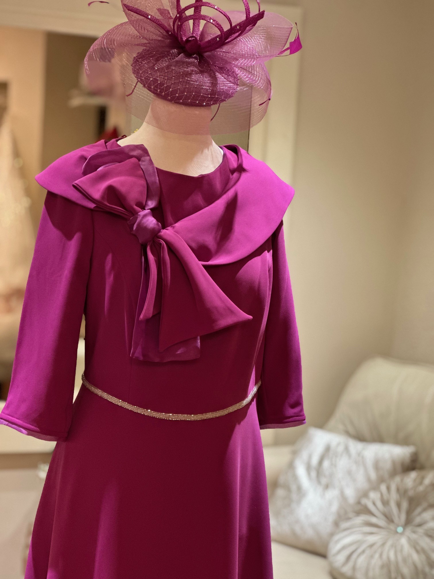 In a gorgeous fuschia colour this perfect ALine dress with a beaded belt and a bow detail at the neckline is sure to turn heads at any occasion