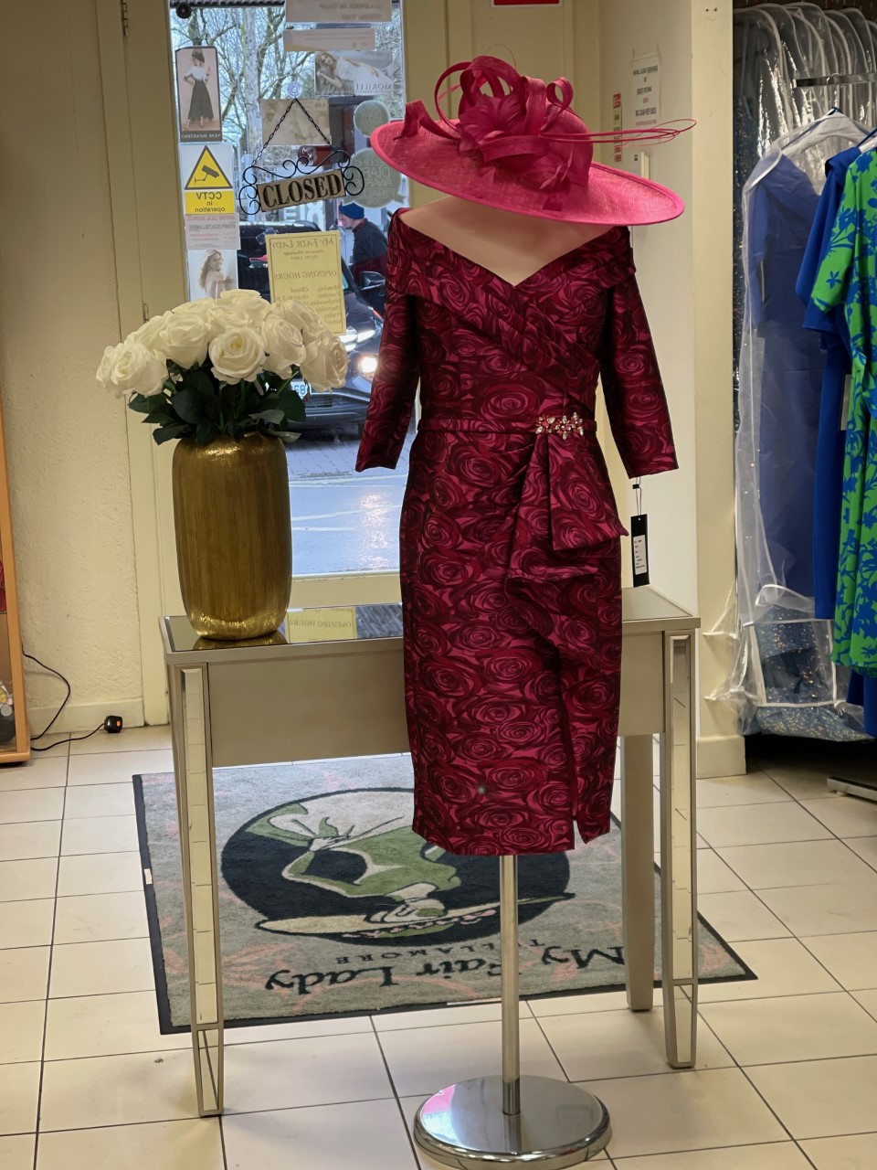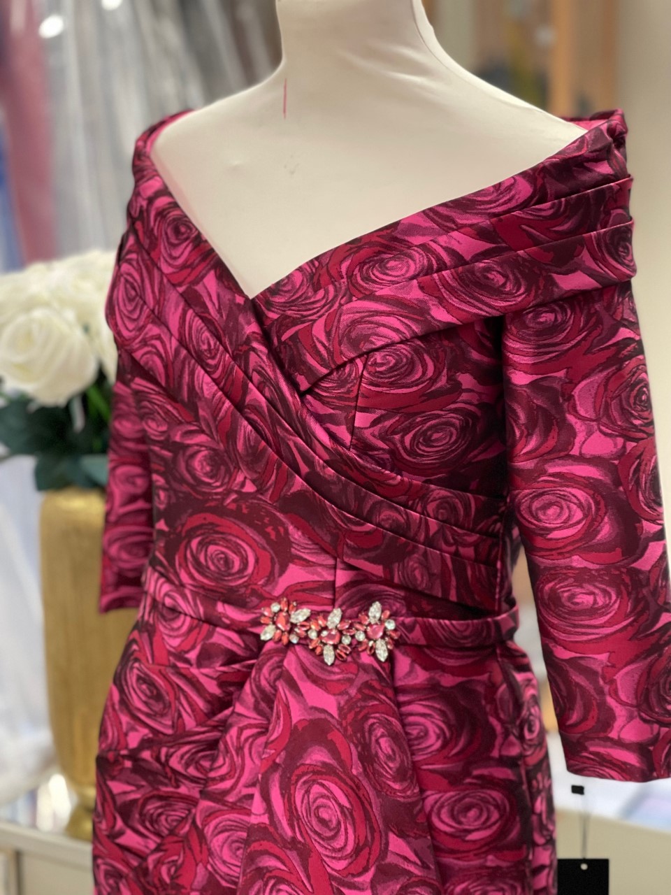 Sophistication and glamour is embodied in this beautiful floral dress with off-the-shoulder neckline. From formal events to weddings, this dress is perfect for any occasion. The ¾ length sleeves create a modest and elegant look.