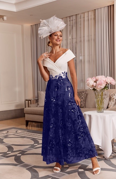 A truly timeless 3/4 length dress, decorated with elegant, beaded flowers. This beautiful off-the-shoulder dress is perfect for any spring occasion from wedding and the races.