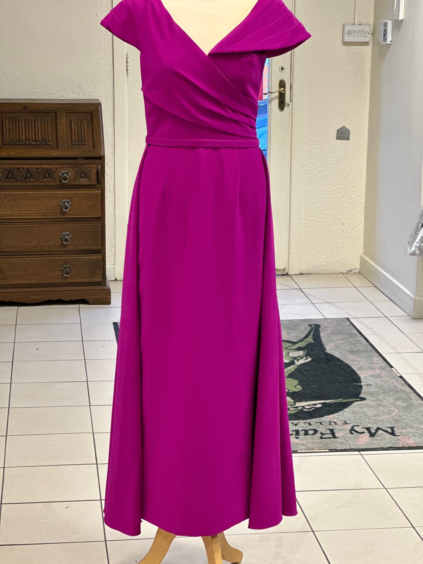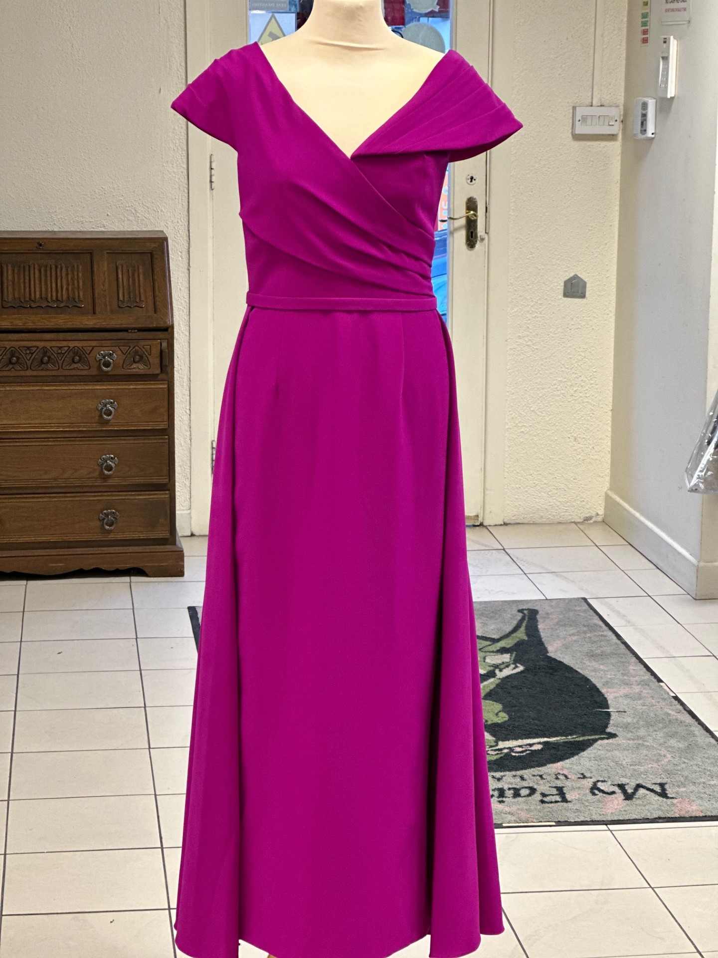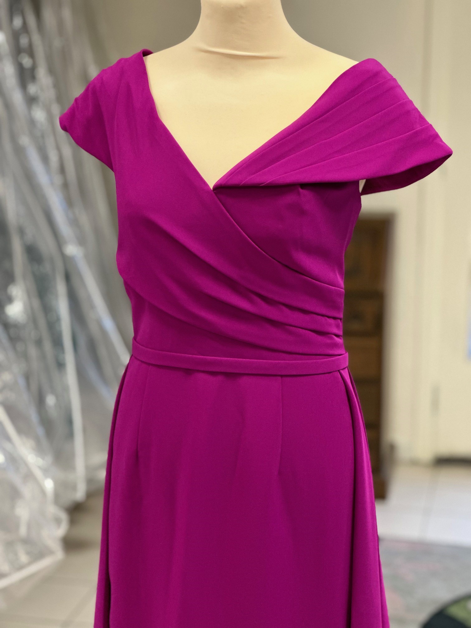 Sophistication and style is embodied in this beautiful knee-length dress with unique overskirt detail. This dress would be perfect a spring or summer wedding
