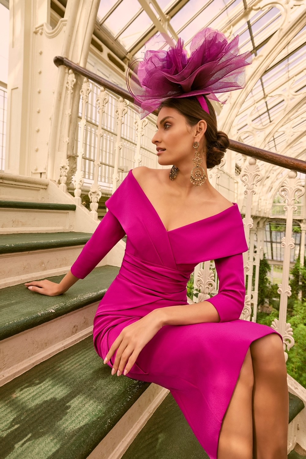 A beautiful, fitted soft crepe dress with 3/4 sleeves and contempered off the shoulder neckline. This modern dress perfect for a chic and sophisticated mother of the bride or groom, complete with pleated detail on the fitted skirt.