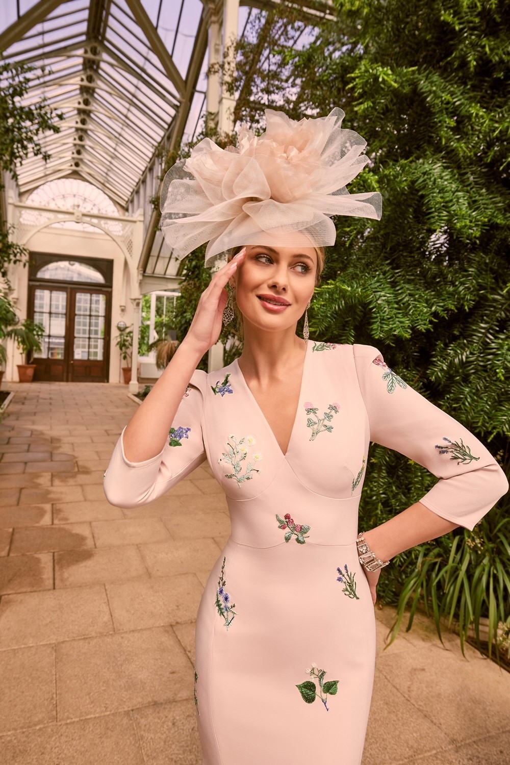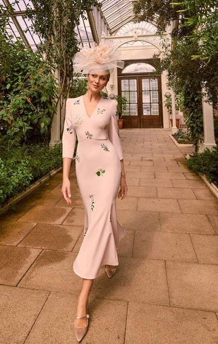 For the perfect summer dress look no further than this beautiful botanical fitted soft crepe dress. Featuring 3/4 sleeves and contemporary embroidered floral appliques. This modern dress perfect for a chic and sophisticated mother of the bride or groom.