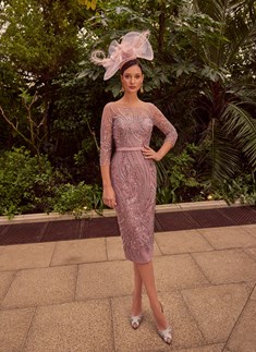 A fitted, knee length, sequin lace dress with contrasting plain belt and modern cape detail.