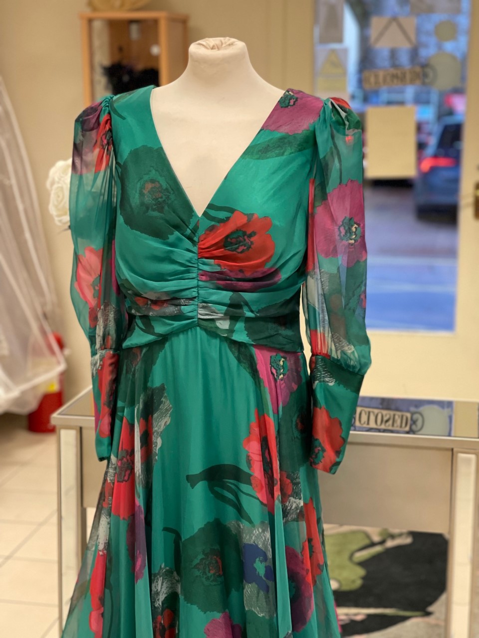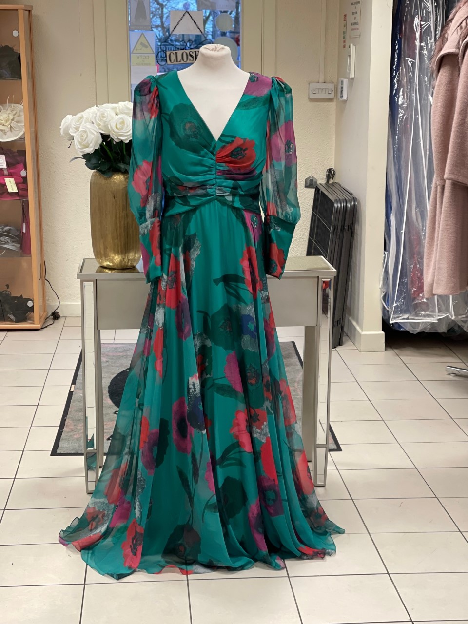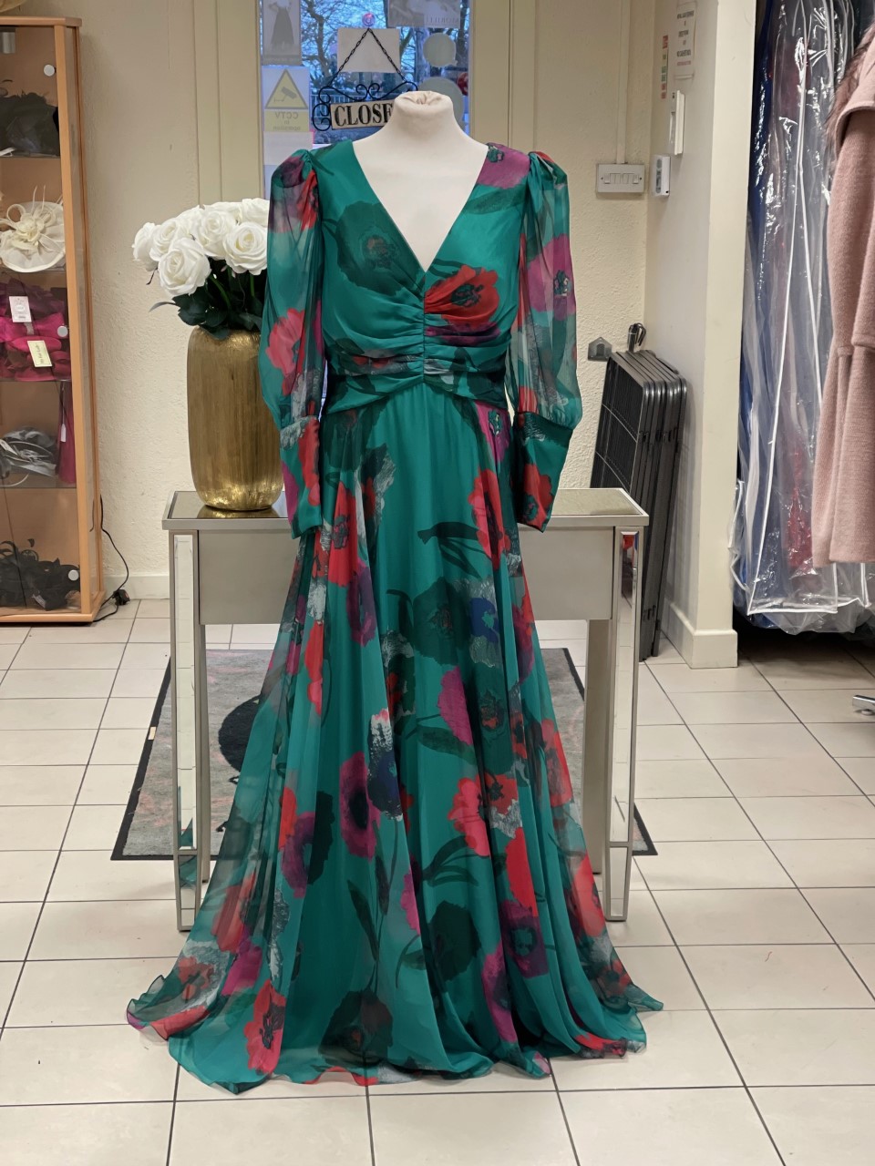 A maxi dress in green with accents of colour. This Carla Ruiz dress has long sleeves and is perfect for a guest at a wedding