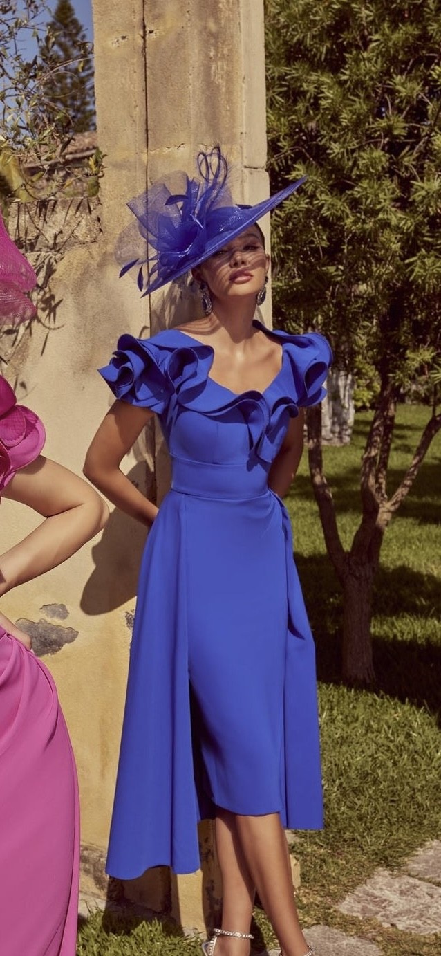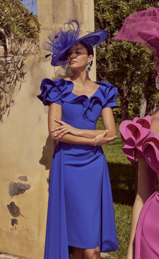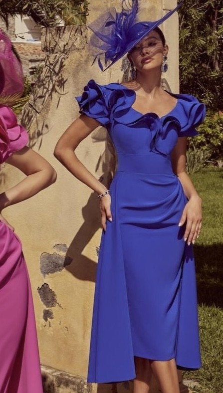 Featuring a fitted skirt with rouching around the tummy area and a half overskirt this dress is just outstanding. It is a crepe dress and has a ruffle v-neckline and ruffle cap sleeves