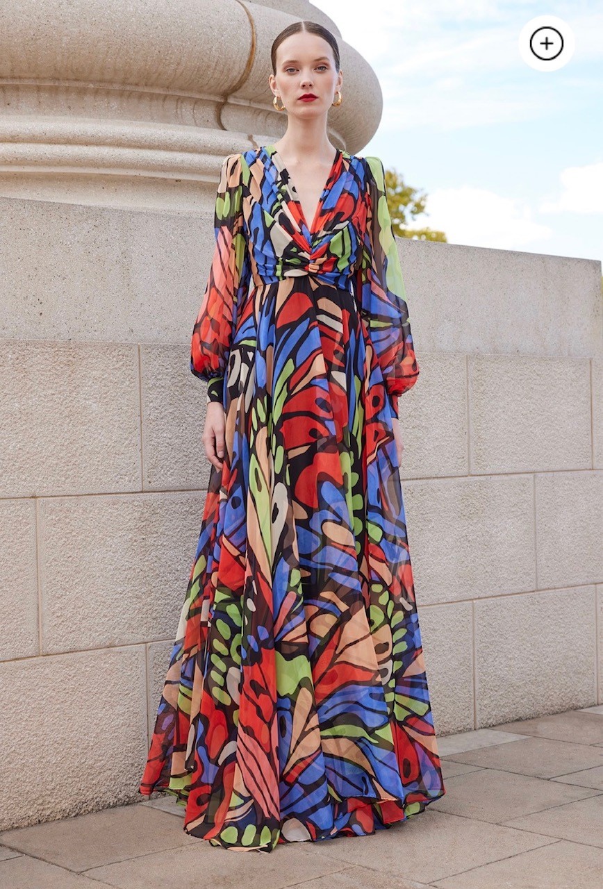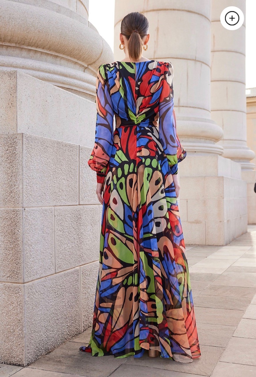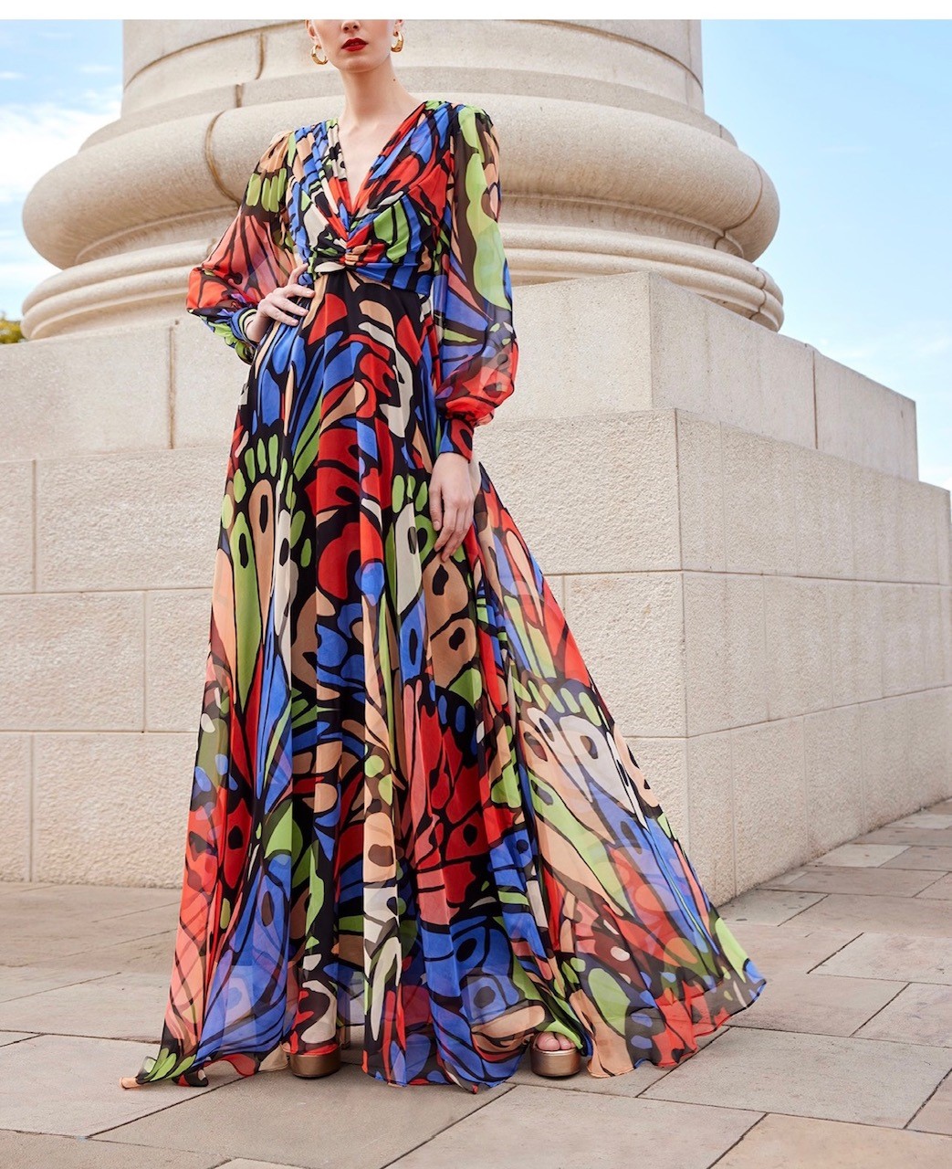 This maxi dress is a real show stopper, with a mix of fabulous colours and a deep V neck with a knot waist detail and long sleeves you can wear it to any special occasion