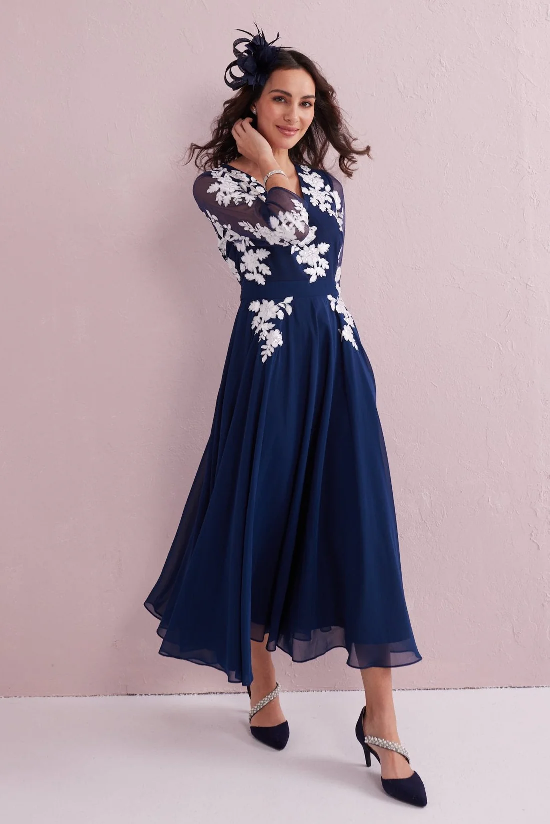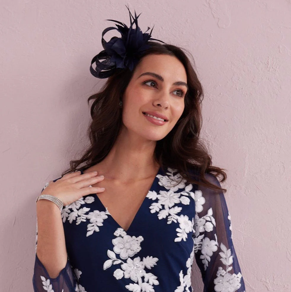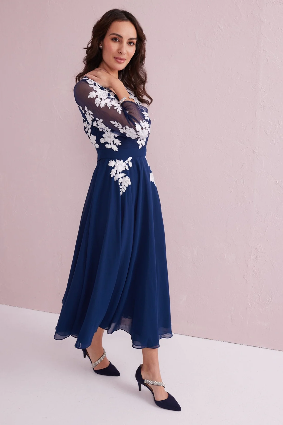 this stunning navy midi dress is designed to make every occasion feel special. Crafted from beautifully flowing chiffon, the dress features delicate white floral appliqué that softly trails across the bodice and sheer sleeves, creating a romantic and feminine look.