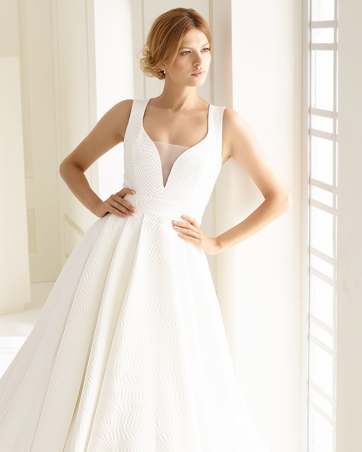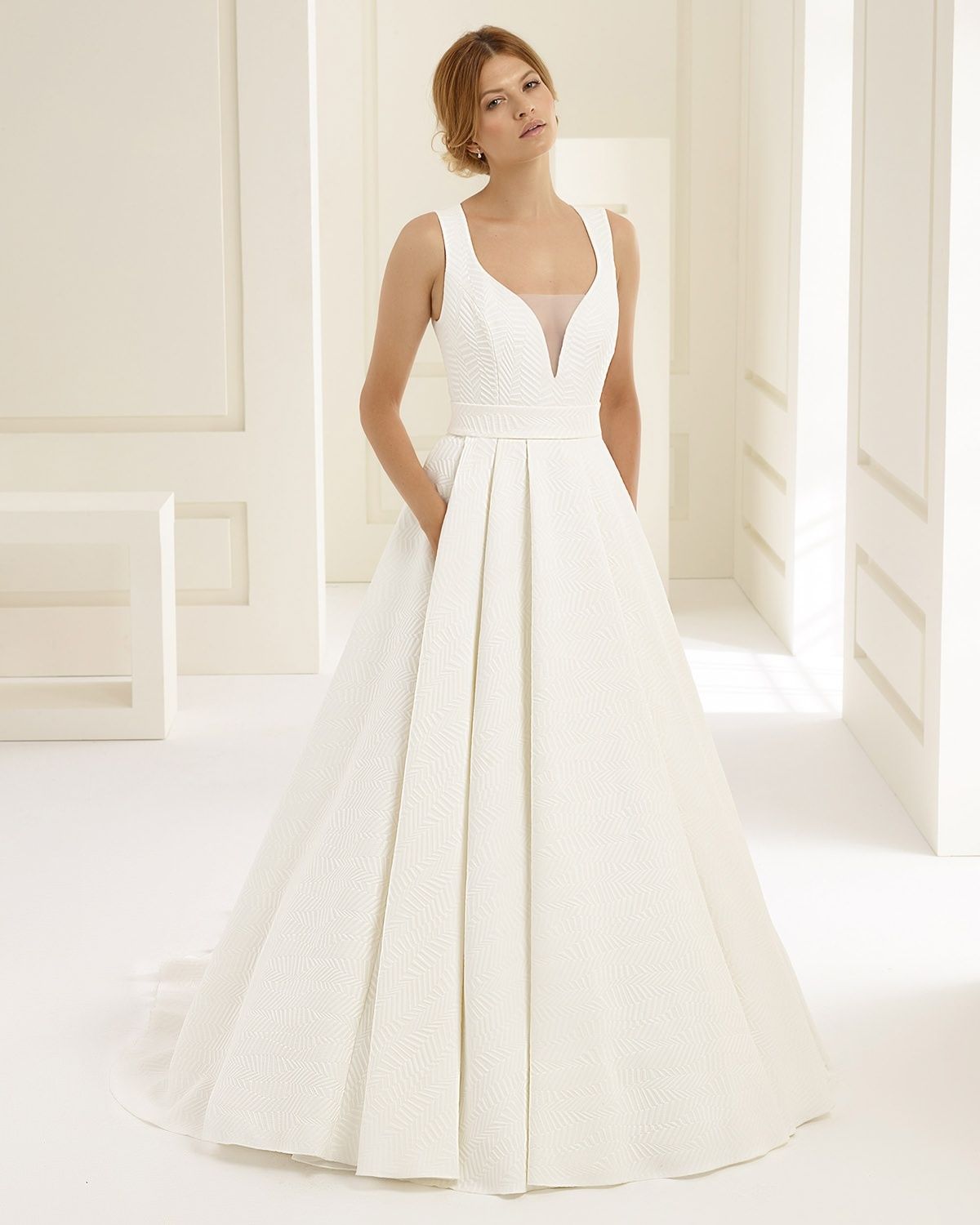 Beautiful A line wedding dress with pockets from Bianc Evento. Deep v neck line.