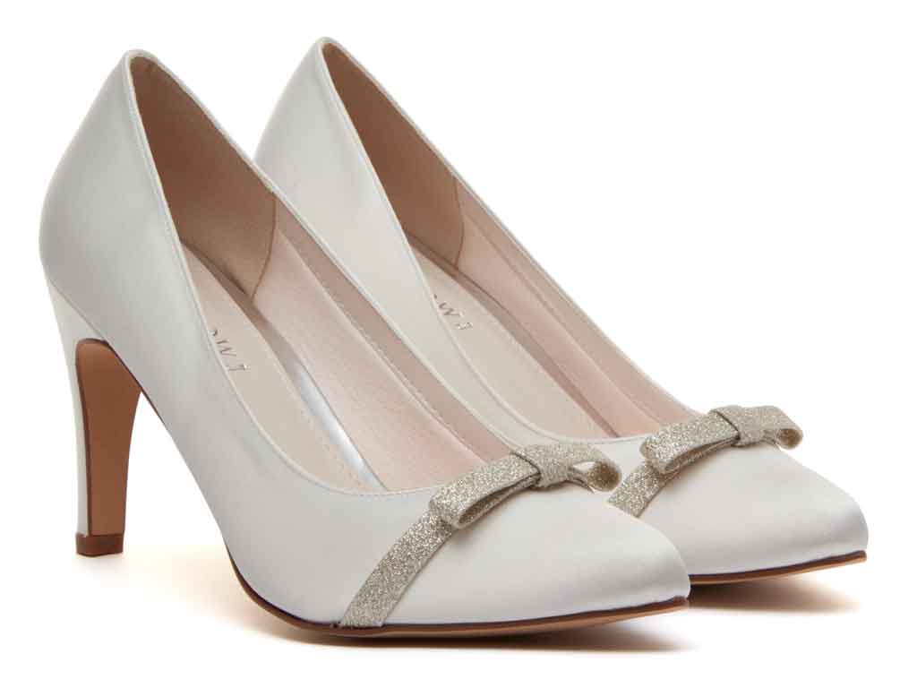 Crafted from lustrous ivory satin, these beautiful bridal shoes have an almond-shaped toe, a mid-height slender heel and silver shimmer bow detail over the front, offering just a little sparkle.