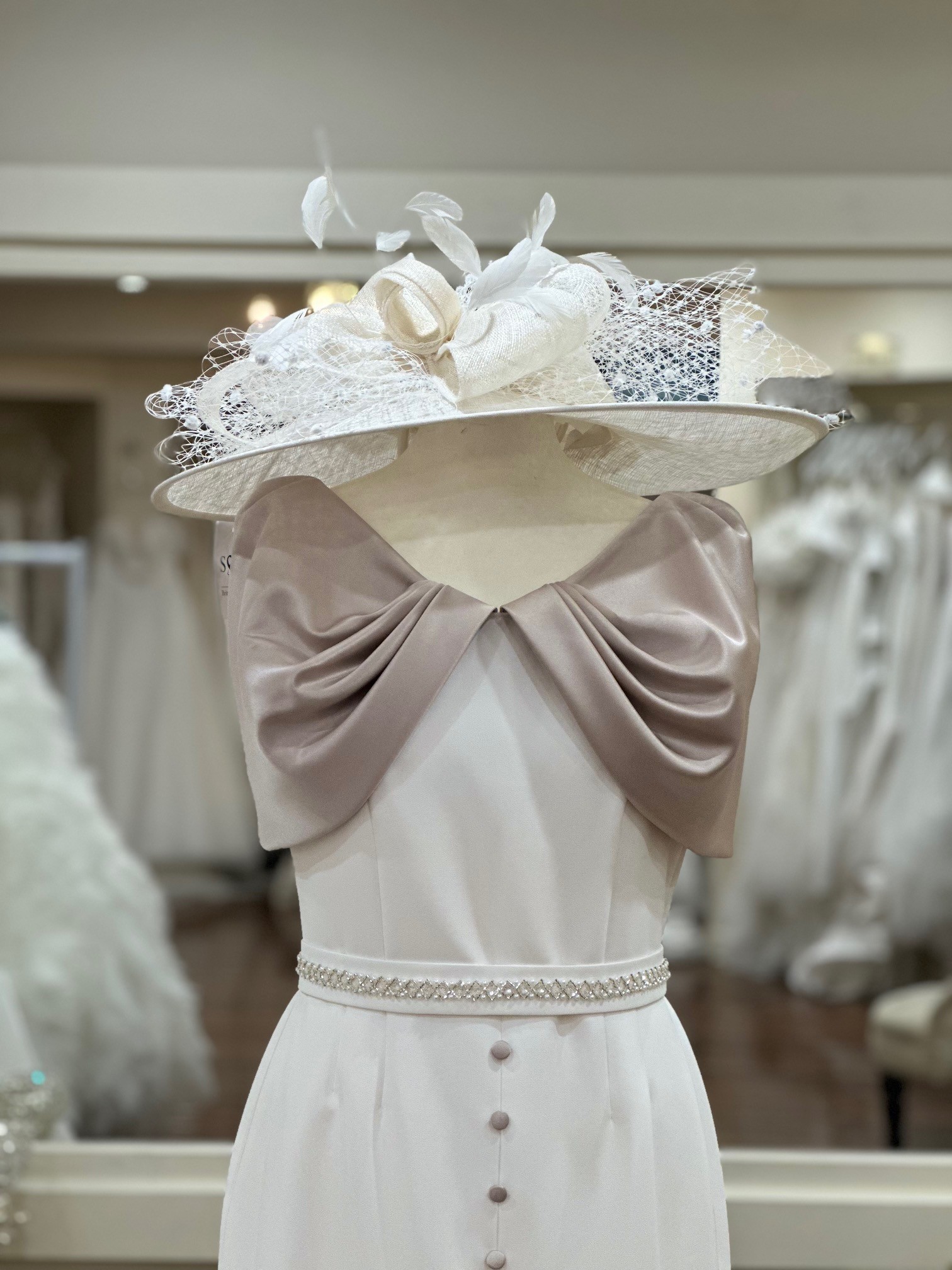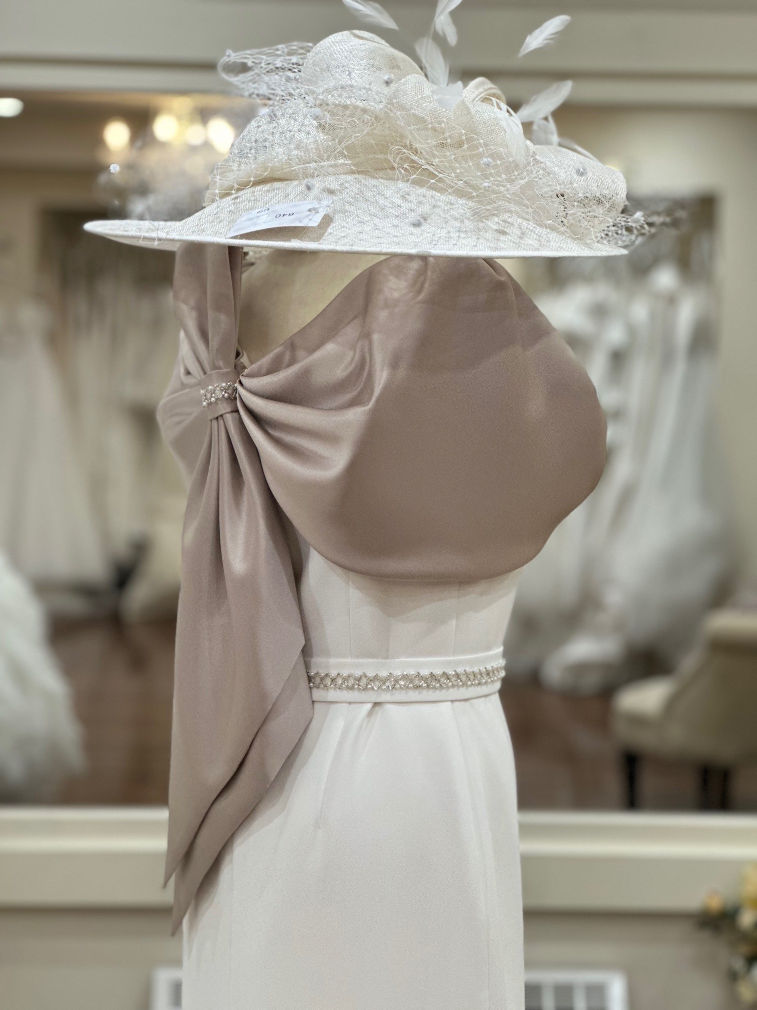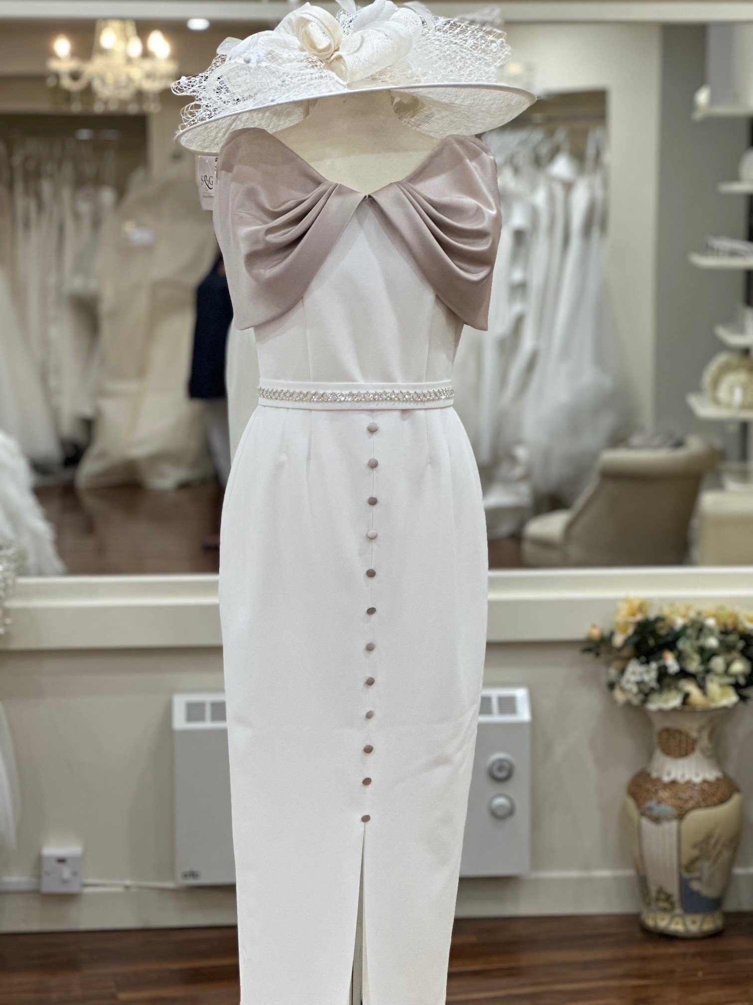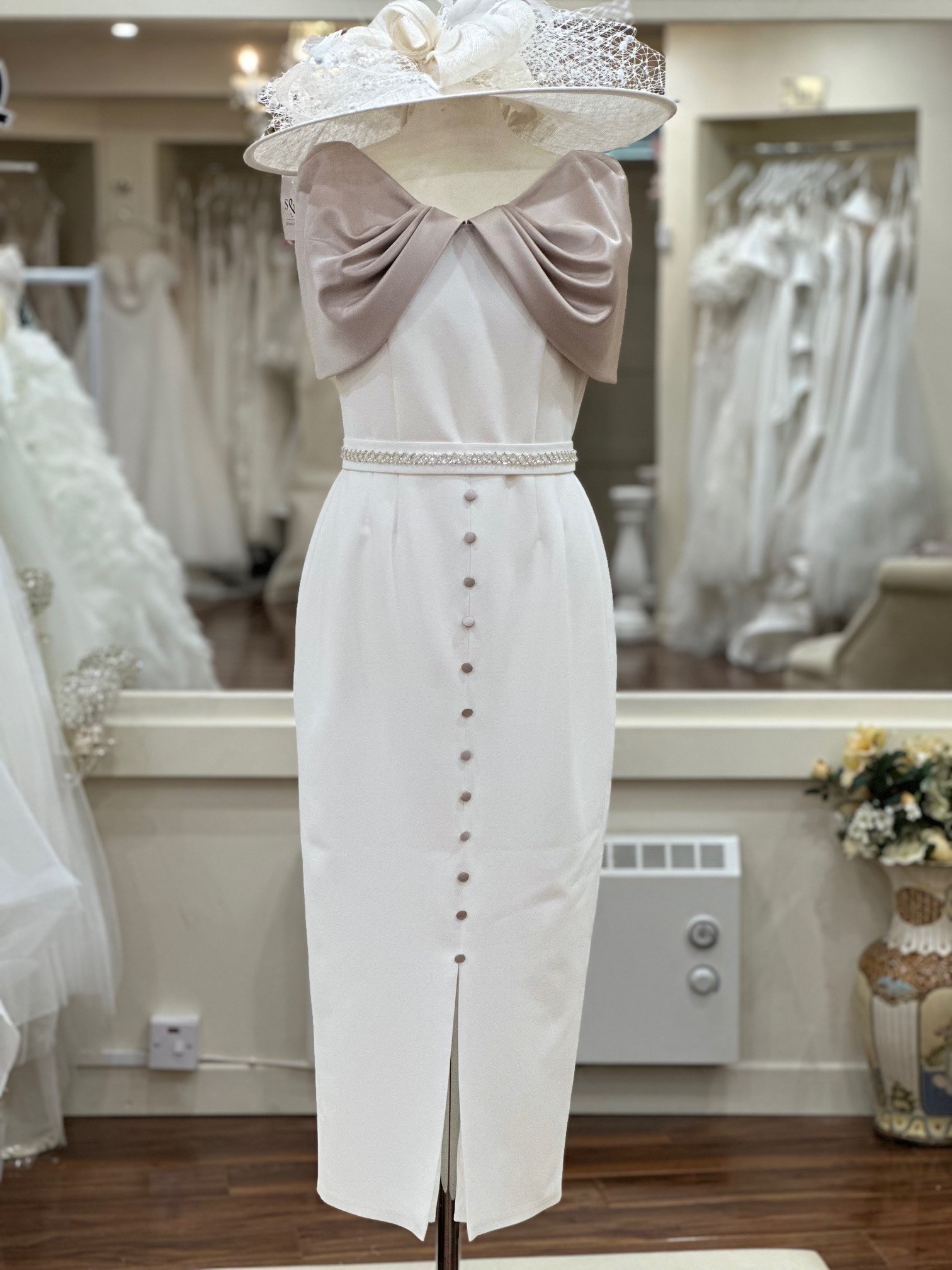 This beautifully tailored ivory dress by the acclaimed designer Anoola is a perfect blend of classic sophistication and contemporary detail. Crafted with a luxurious gold satin sleeve, the design flows into an eye-catching bow detail at the back, adding a unique and graceful touch.
