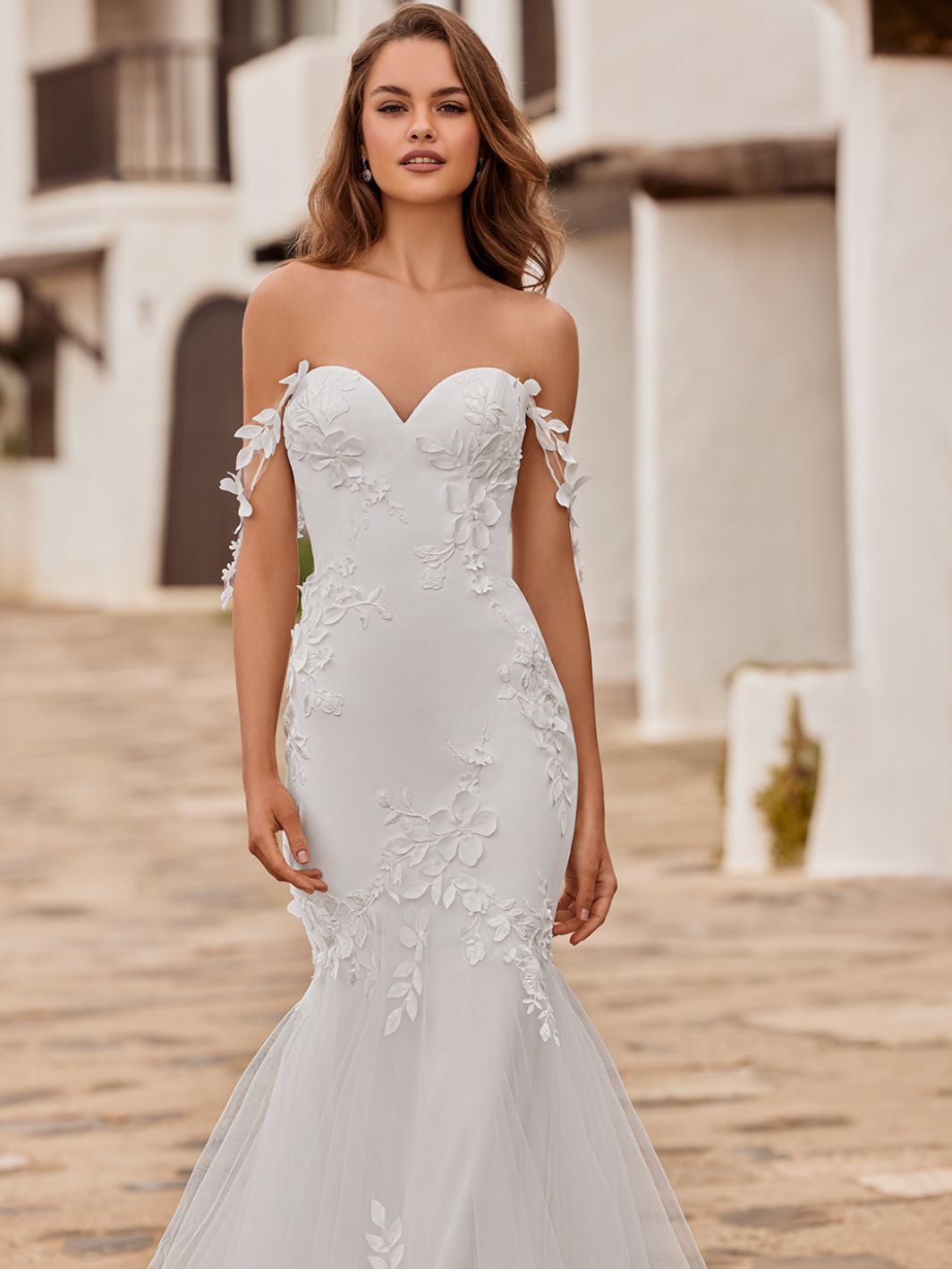 Its sleek stretch georgette silhouette is beautifully adorned with breathtaking 3D Mikado floral embroidered appliques that continue to the detachable off-the-shoulder straps that gorgeously drape from the classic sweetheart neckline.