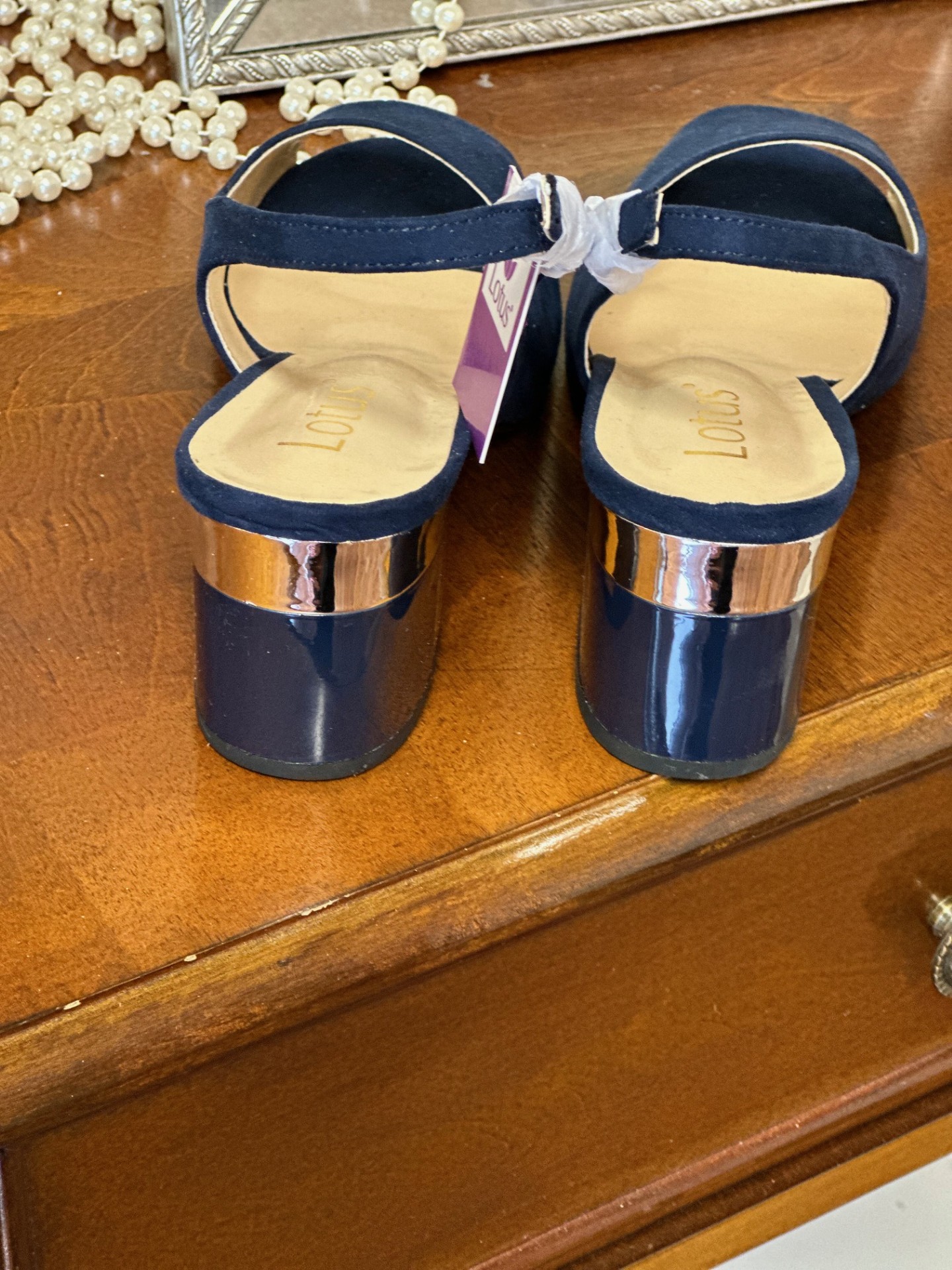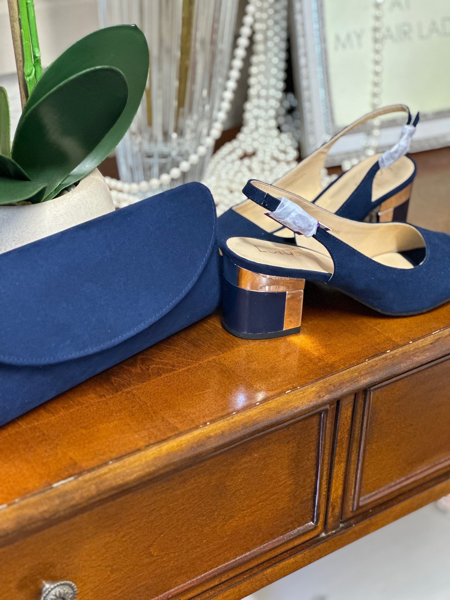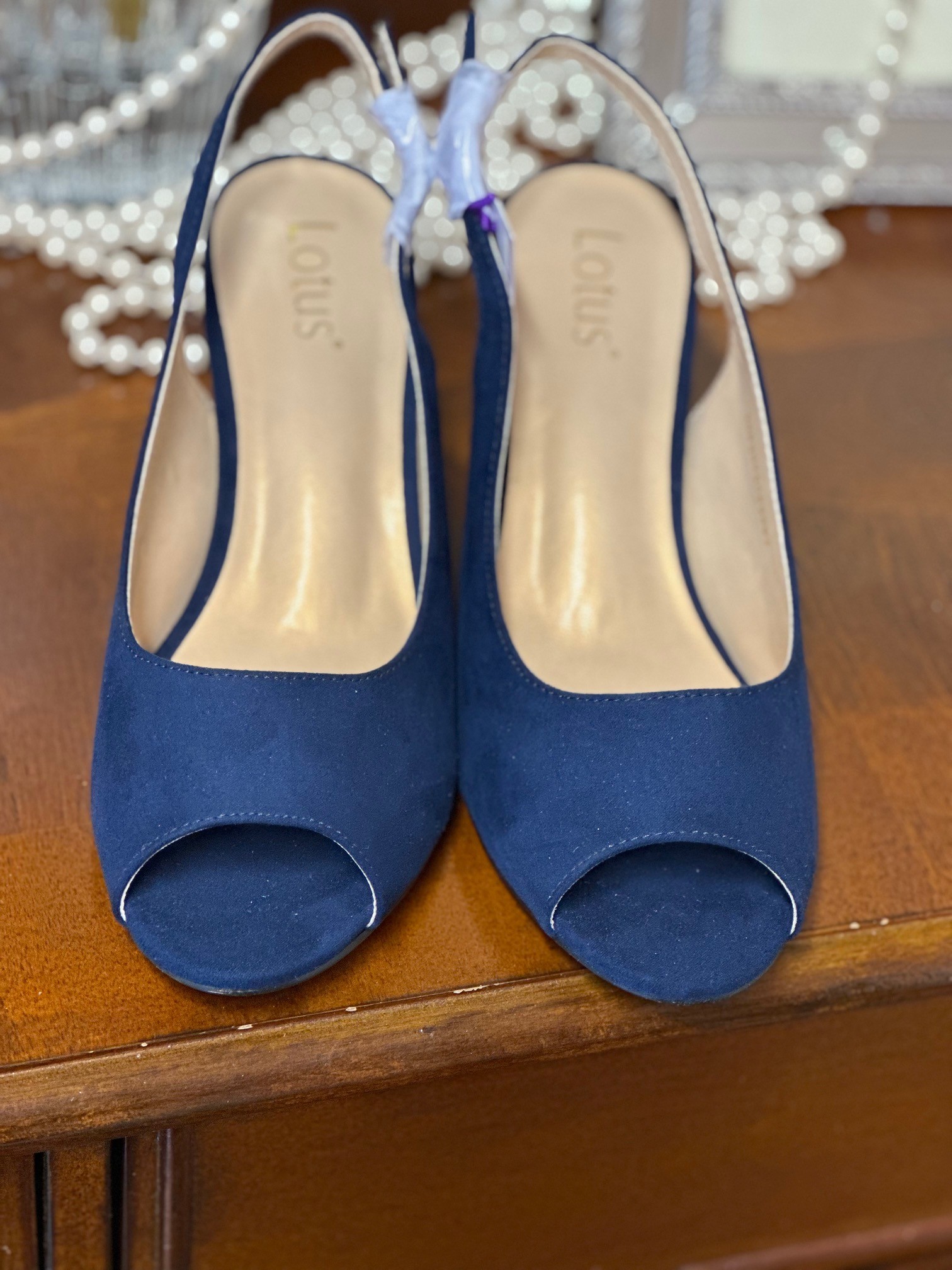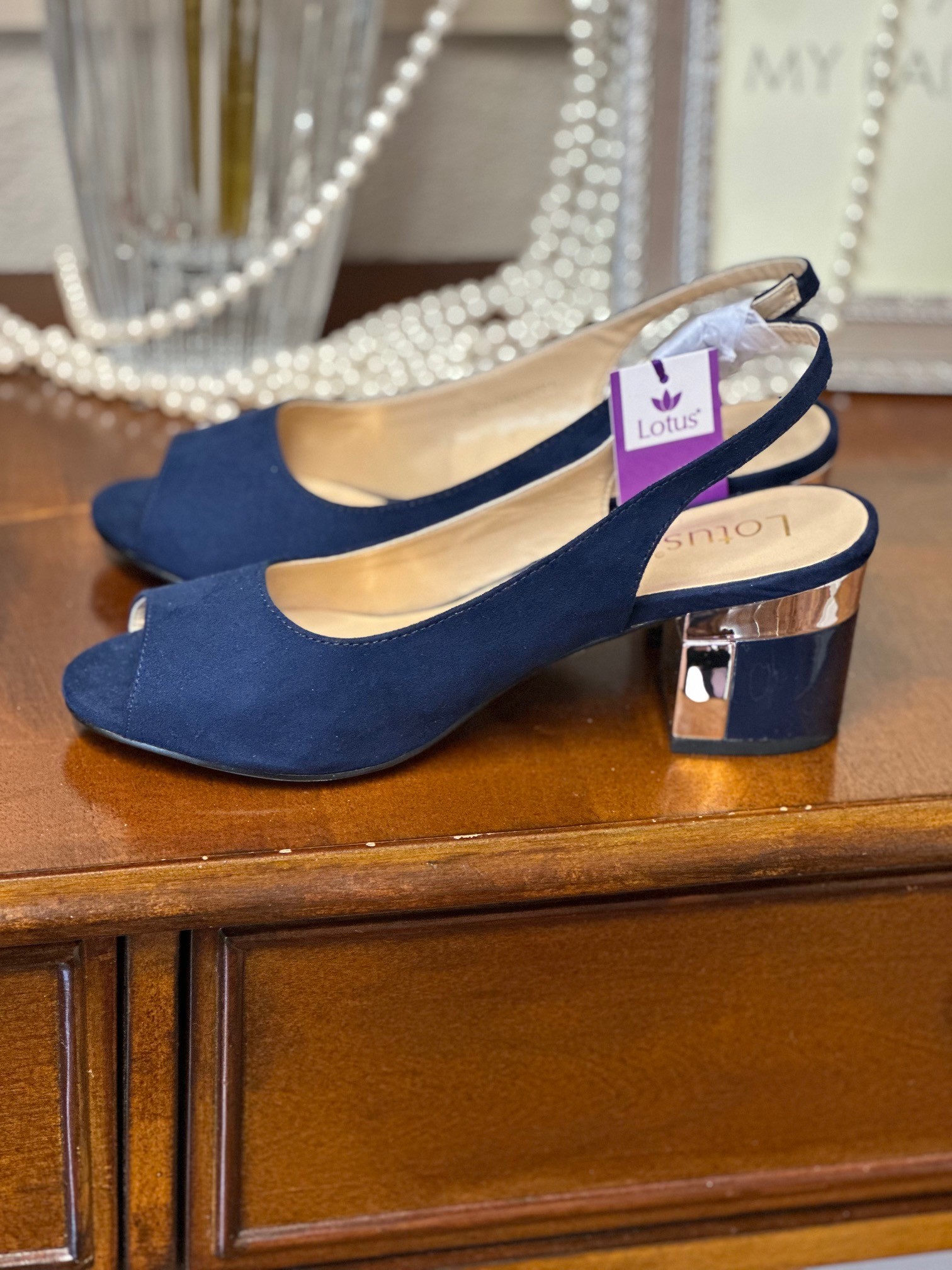 Home / Shoes & Bags / Shoes & Bags - Occasion Wear / Evelyn Shoes Navy SuedeSet to slide seamlessly into your hard-working wardrobe is the Lotus Evelyn slingback shoe. This understated navy peep-toe shoe is crafted from microfibre, it encompasses an adjustable slingback and a contemporary 6.5cm block heel that is enhanced by a decorative metal plate and trim. This Lotus women’s navy shoe coordinates effortlessly with the Claire handbag.