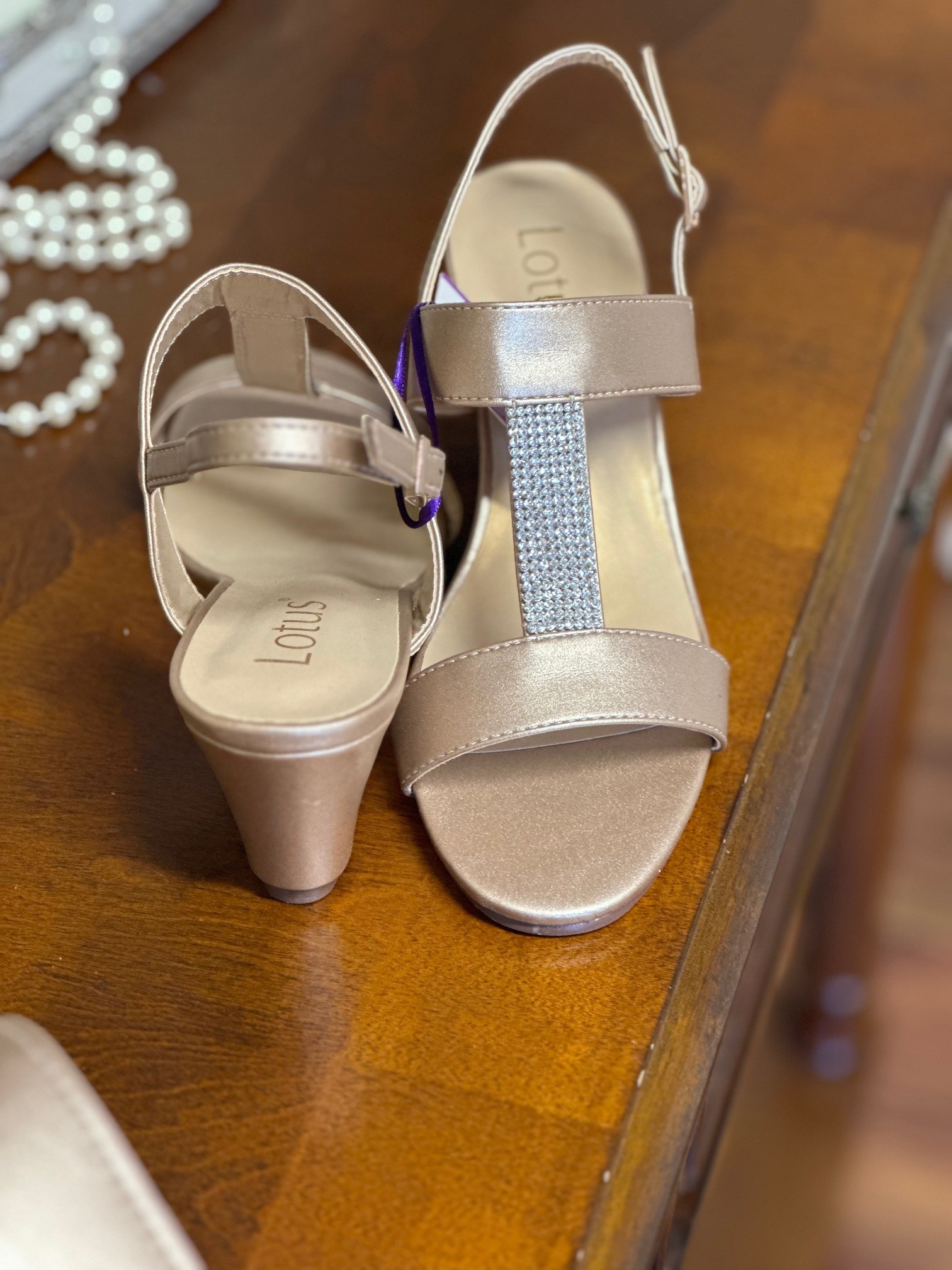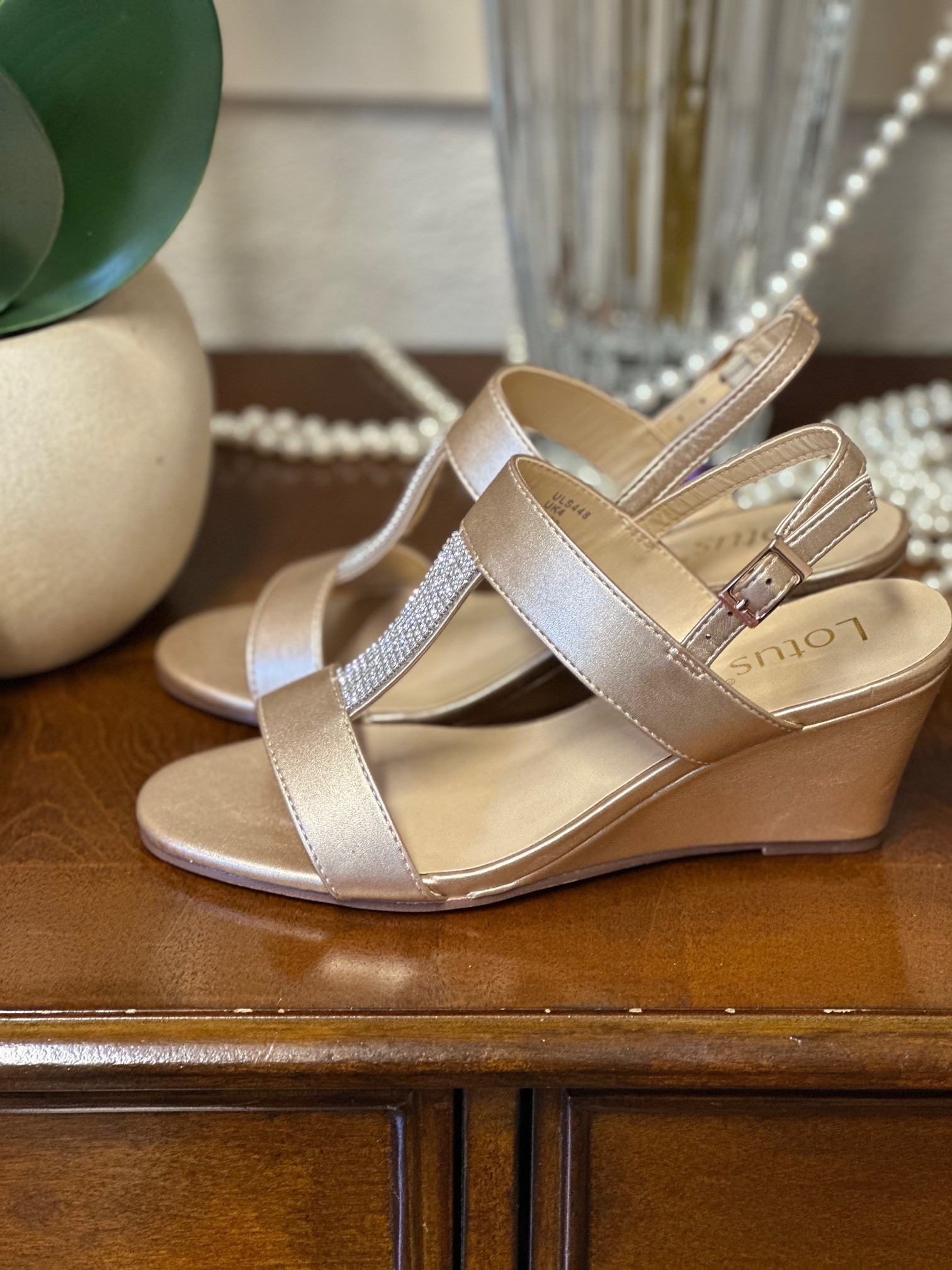 The perfect accompaniment to glamorous looks is the Lotus Ilaria open toe sandal. This elegant women’s style encompasses a band of diamantes that runs up the foot and a 6.5cm wedge heel. Finished with an adjustable slingback for an enhanced fit, this women’s gold sandal is not only a head-turning style, but it is exceptionally wearable too. Pair the Lotus Ilaria sandal with the coordinating Lotus Amy handbag for any special occasion.