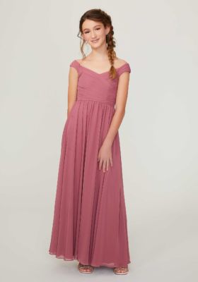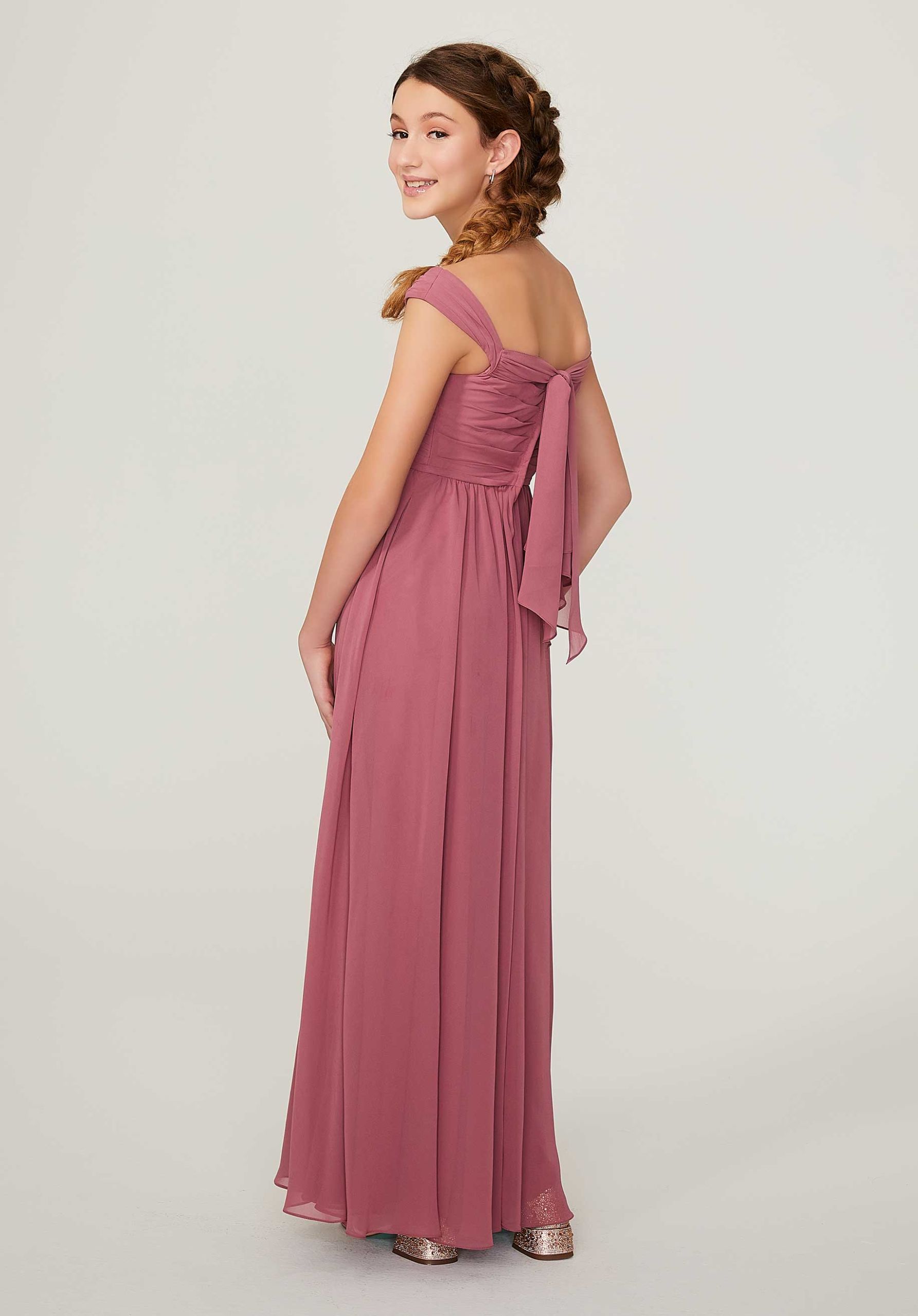 Sweet chiffon junior bridesmaid dress features a draped, off-the-shoulder bodice with cute tied detail in the back. Shown in Rosewood and Slate. View swatch card for available colors.
