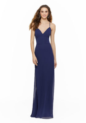 Chiffon bridesmaid dress featuring a deep v-neck, spaghetti straps and keyhole back. Natural waist and A-line skirt