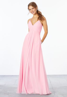 Chiffon A-line bridesmaid dress with a pleated v-neck bodice and keyhole back. Shown in blossom.