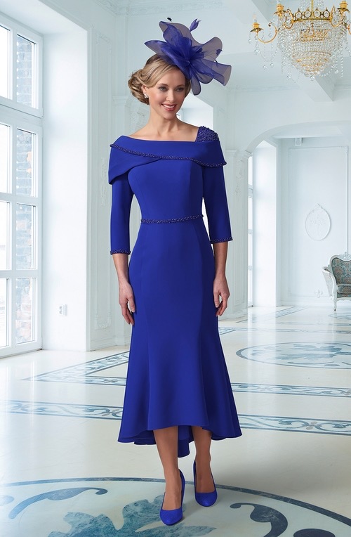 A perfect cobalt blue dress in a fitted shape with a beaded belt and three quarter length sleeves