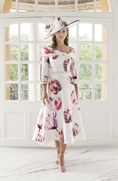 The ivory base is adorned with oversized blush and rose-toned florals, creating a romantic, painterly effect. A gently defined waist flows into a full, swishy midi skirt that moves beautifully with every step, offering both comfort and striking presence.