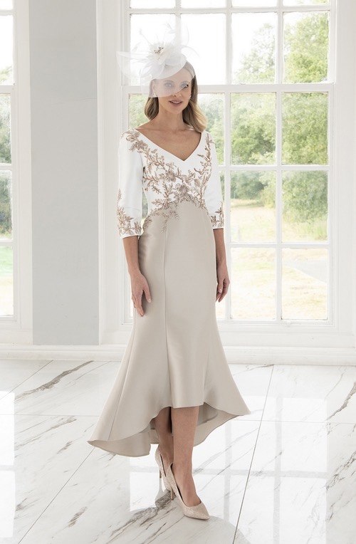 Home / Occasion Wear / Spring Summer 2026 / IR8812TJ Ivory Champagne DressThis exquisite dress by Veromia is a beautiful blend of ivory and soft champagne, offering timeless elegance with a modern finish. The flattering V-neckline is framed by delicate embroidered detailing that flows gracefully across the bodice and three-quarter sleeves, adding texture and understated sparkle.