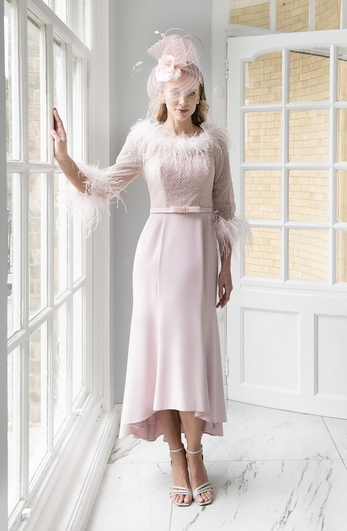 This beautiful dress by Veromia is crafted in a soft blush pink, offering a romantic and contemporary take on occasionwear. The fitted bodice features delicate texture and is finished with feather trim at the neckline and cuffs, adding lightness and elegant movement to the design.