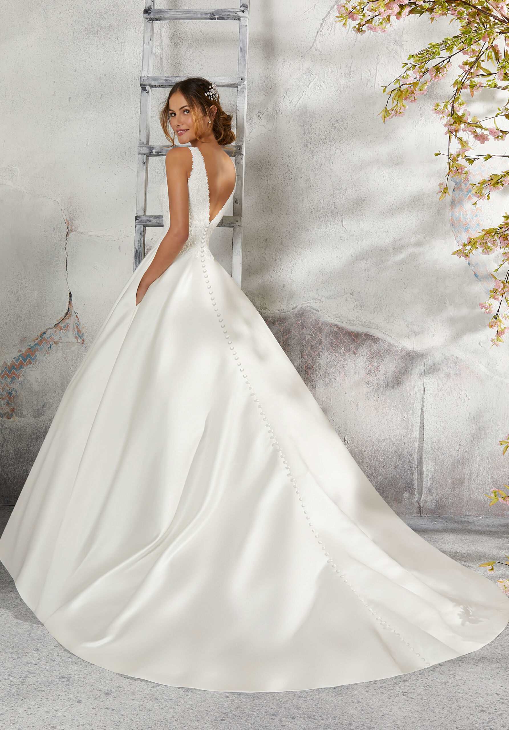 Home / Wedding Dresses / Morilee Wedding Dresses / Blu Collection Wedding Dresses / 5684 LaurieThis elegant sleeveless Laurie designer bridal gown features beautiful appliquès, lace, and beading on an intricately designed satin wedding dress. Available in white and ivory, the v-neck neckline completes the ball gown silhouette of this designer bridal gown.