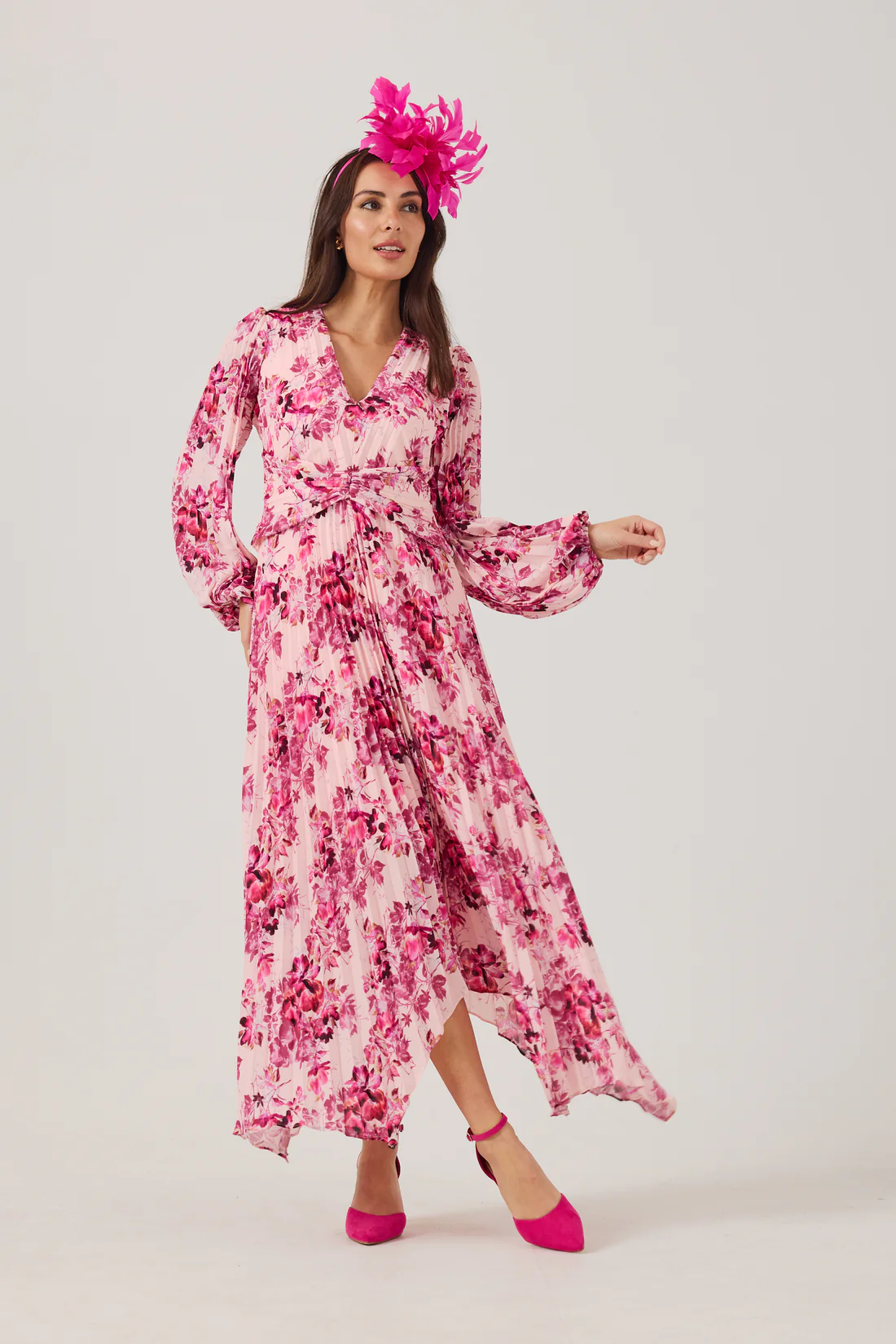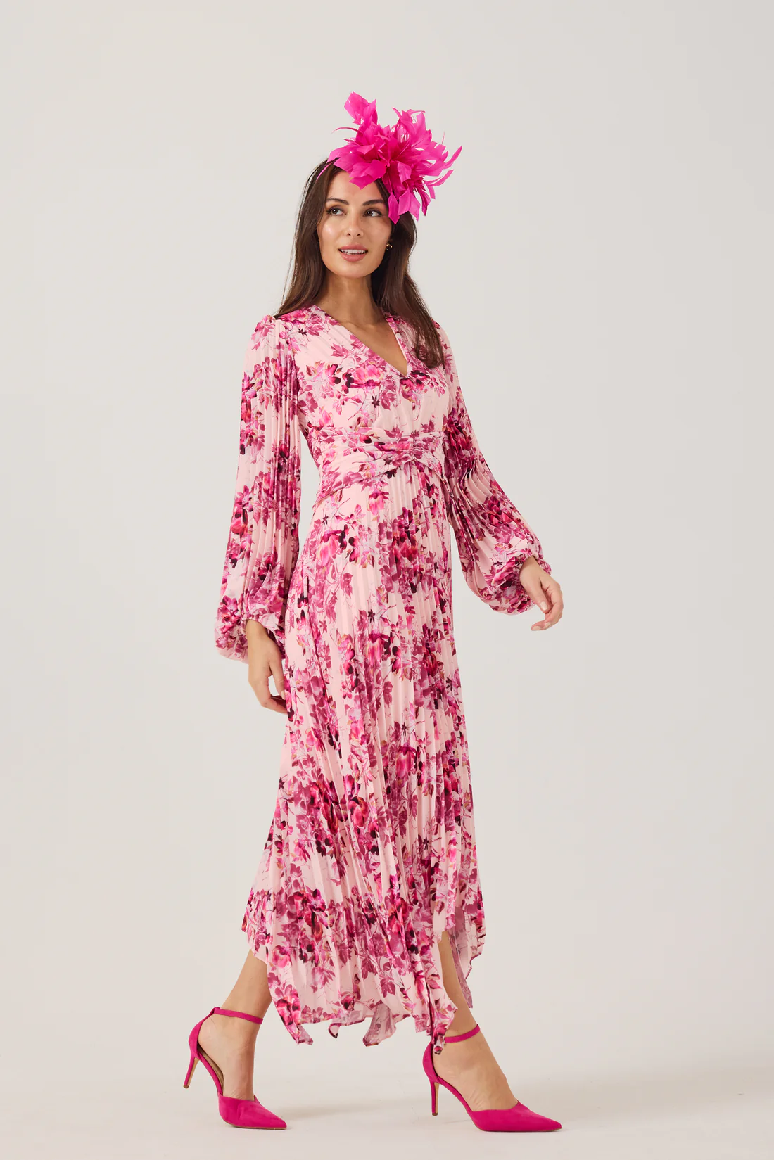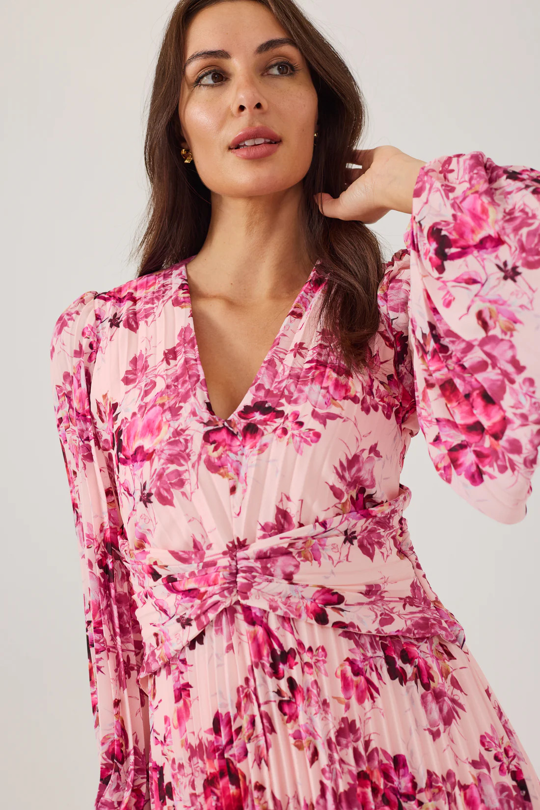 Romantic, feminine and effortlessly elegant, this beautiful blush pink midi dress is the perfect choice for special occasions. Crafted from soft flowing fabric, it features a delicate floral print in rich shades of pink that creates a fresh and graceful look.