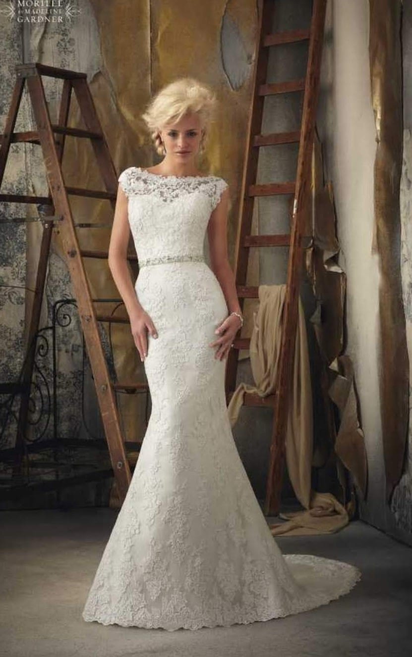 Mori Lee gown style 1901 - Mermaid bridal gown features sweetheart neckline under a lace covered bodice, Venice Lace Appliques on Net.