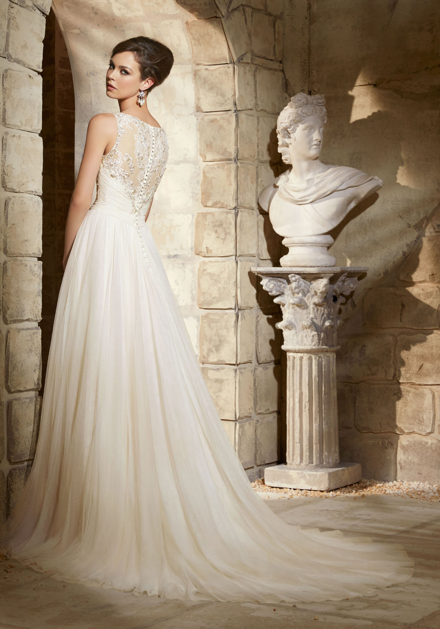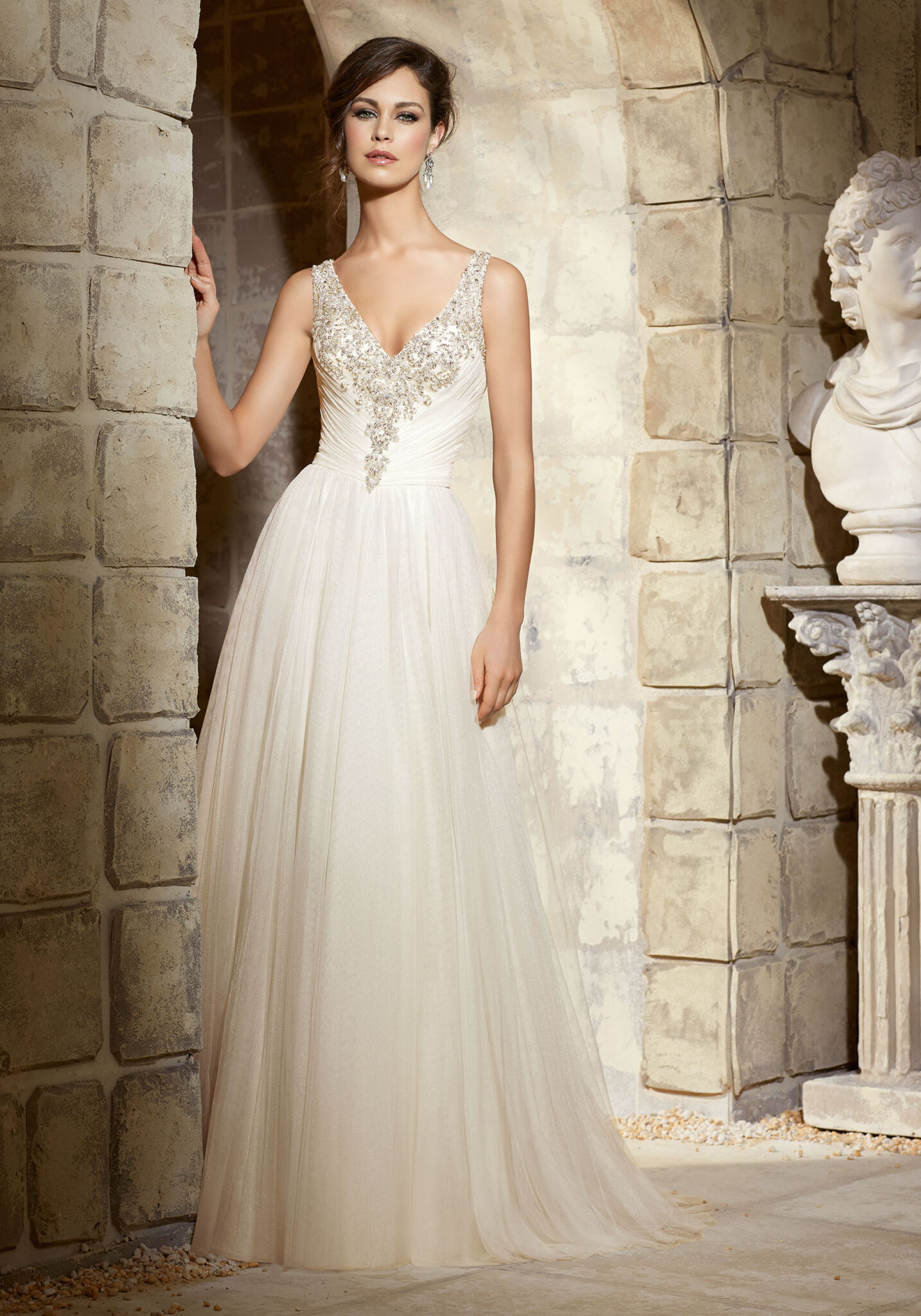 Metallic embroidery and crystal beading accents the plunging V-neck on this Net Bridal Dress.