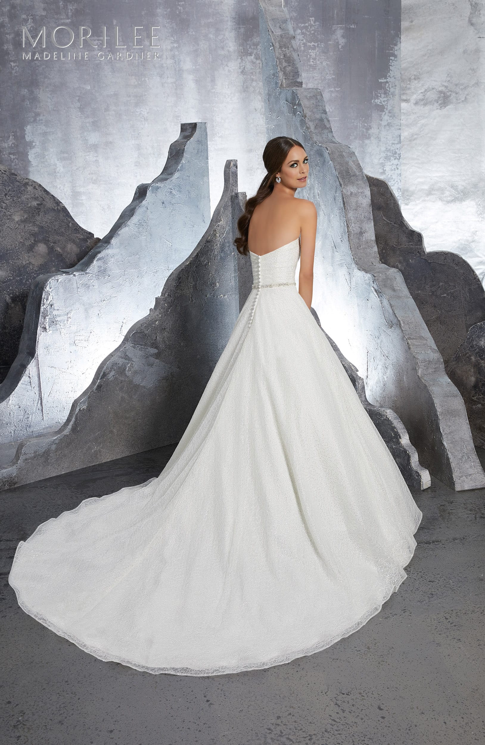 Princess Ballgown Featuring Frosted Beading on Chantilly Lace. A deep sweetheart neckline accentuates your bust, while asymmetrical gathers crisscross about the bodice