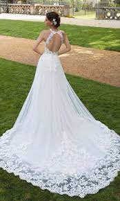 Showcasing a sleeveless illusion lace bodice with jewel neckline and a stunning framed open back. This bridal gown is crafted with frosted lace appliques on a soft english net over glitter net ball gown with wide scalloped hemline chapel train