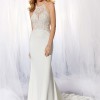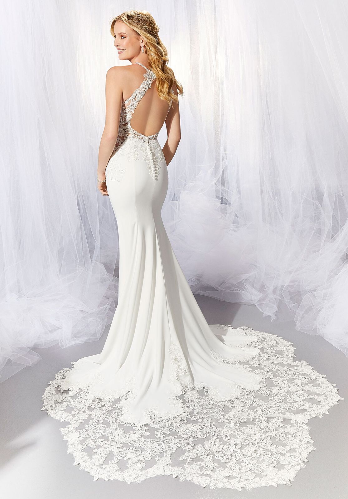This 6933 fitted bridal gown features a lace bodice over a stretch crepe skirt, with a modified halter neckline and cutout back. Back buttons point to the cutaway petal train.