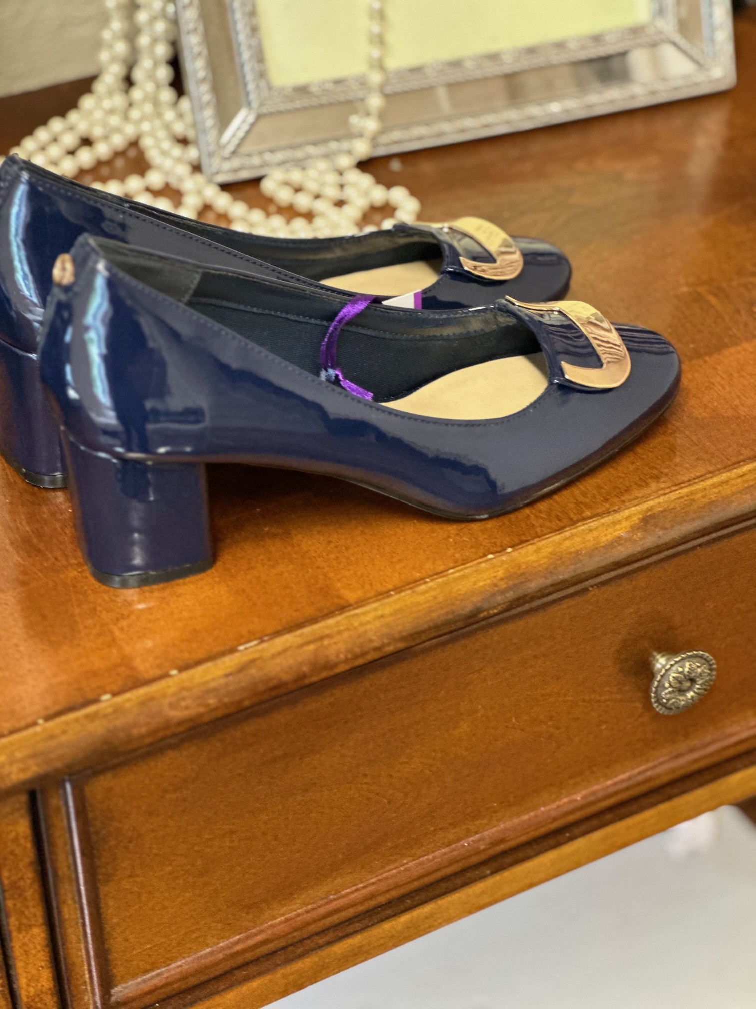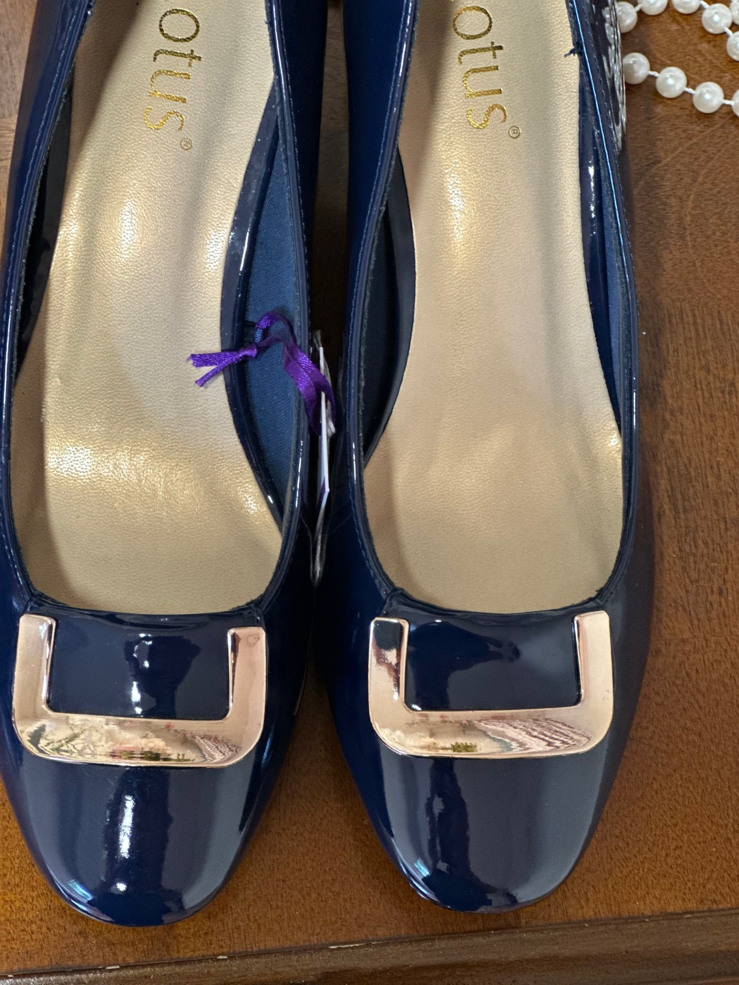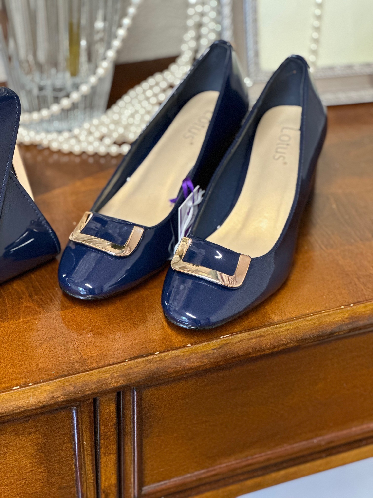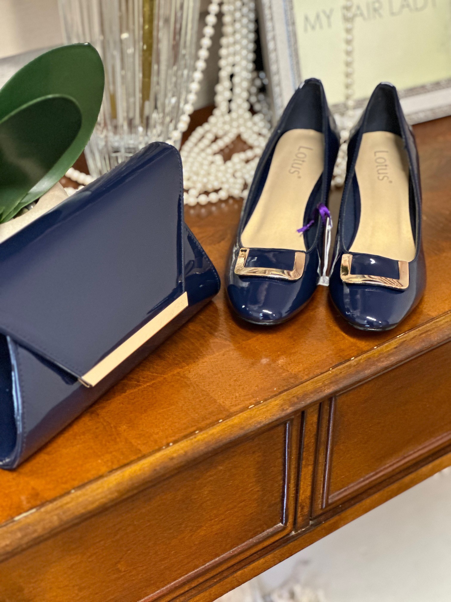 For classic everyday dressing opt for the Lotus Aubrey court shoe. This round toe navy court shoe is finished with a glossy patent upper and chic polished metal hardware that adds a decorative touch. Nestled on a 5.5cm block heel this easy to wear women’s shoe is effortlessly chic and at optimum of style. Team the Lotus Aubrey heeled pump with the matching Martha clutch bag.