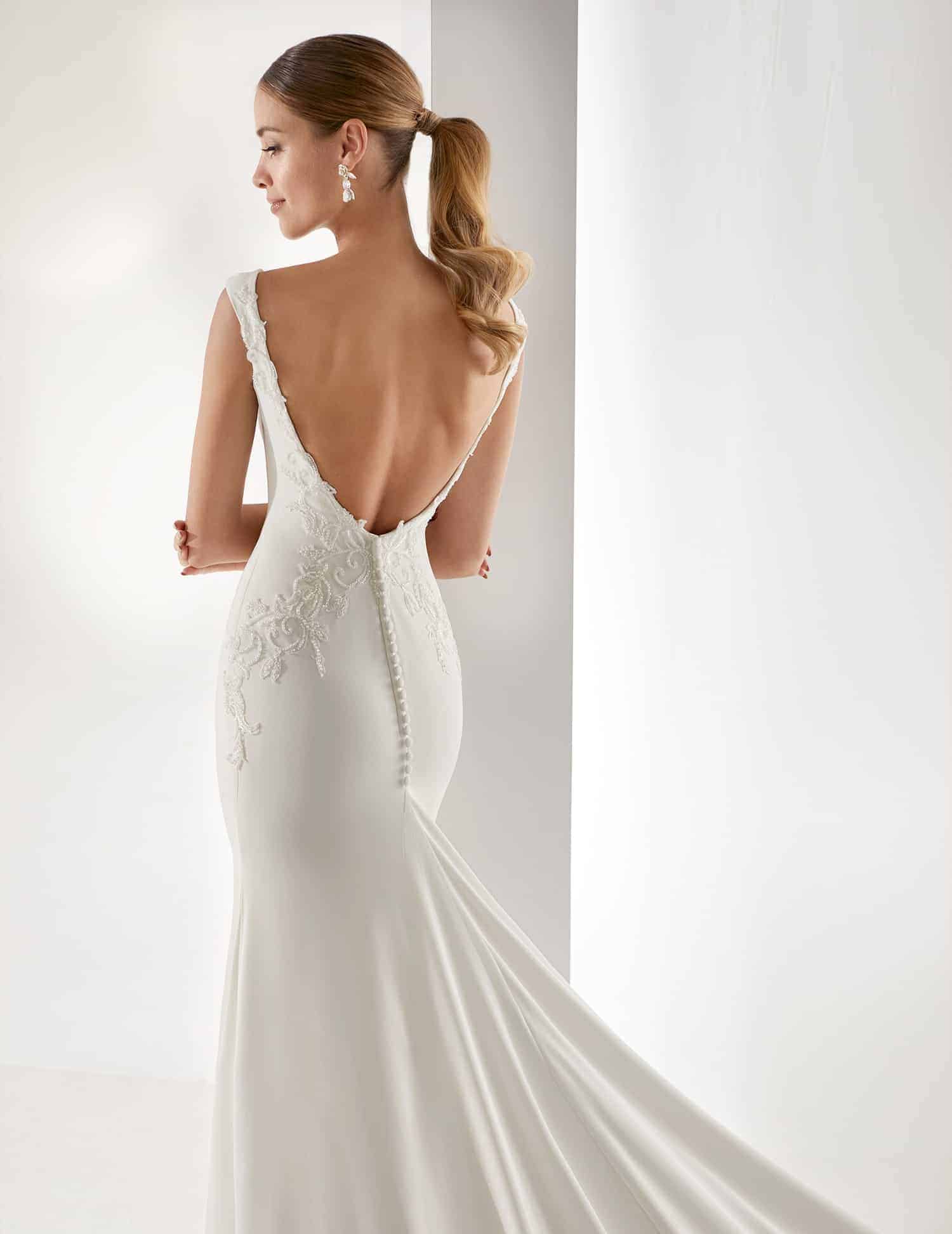 FABULOUS CREPE FITTED BRIDAL GOWN WITH FLOWING TRAIN AND BEADED DETAILING