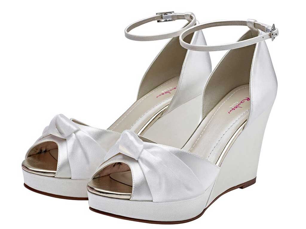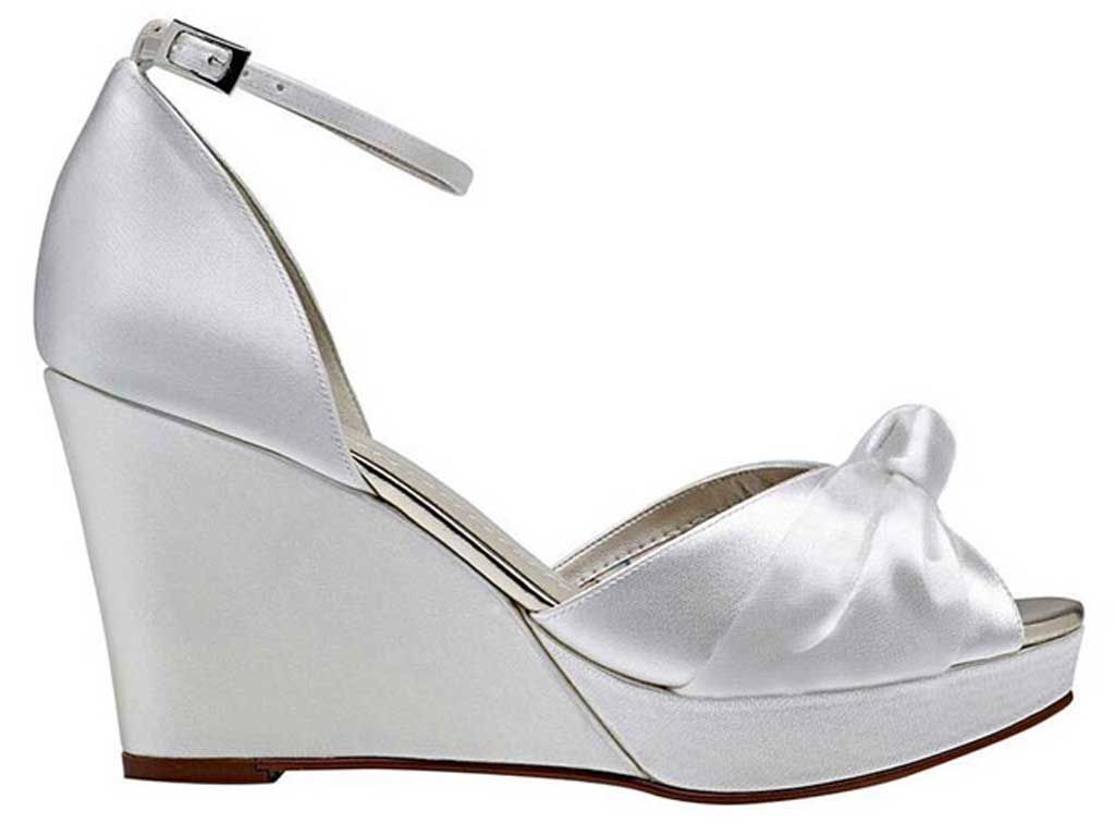 These peep toe platform wedges are crafted from beautiful ivory satin and feature stylish knot detail over the front of the foot, a removable, delicate ankle strap, and are lined with glamorous gold.