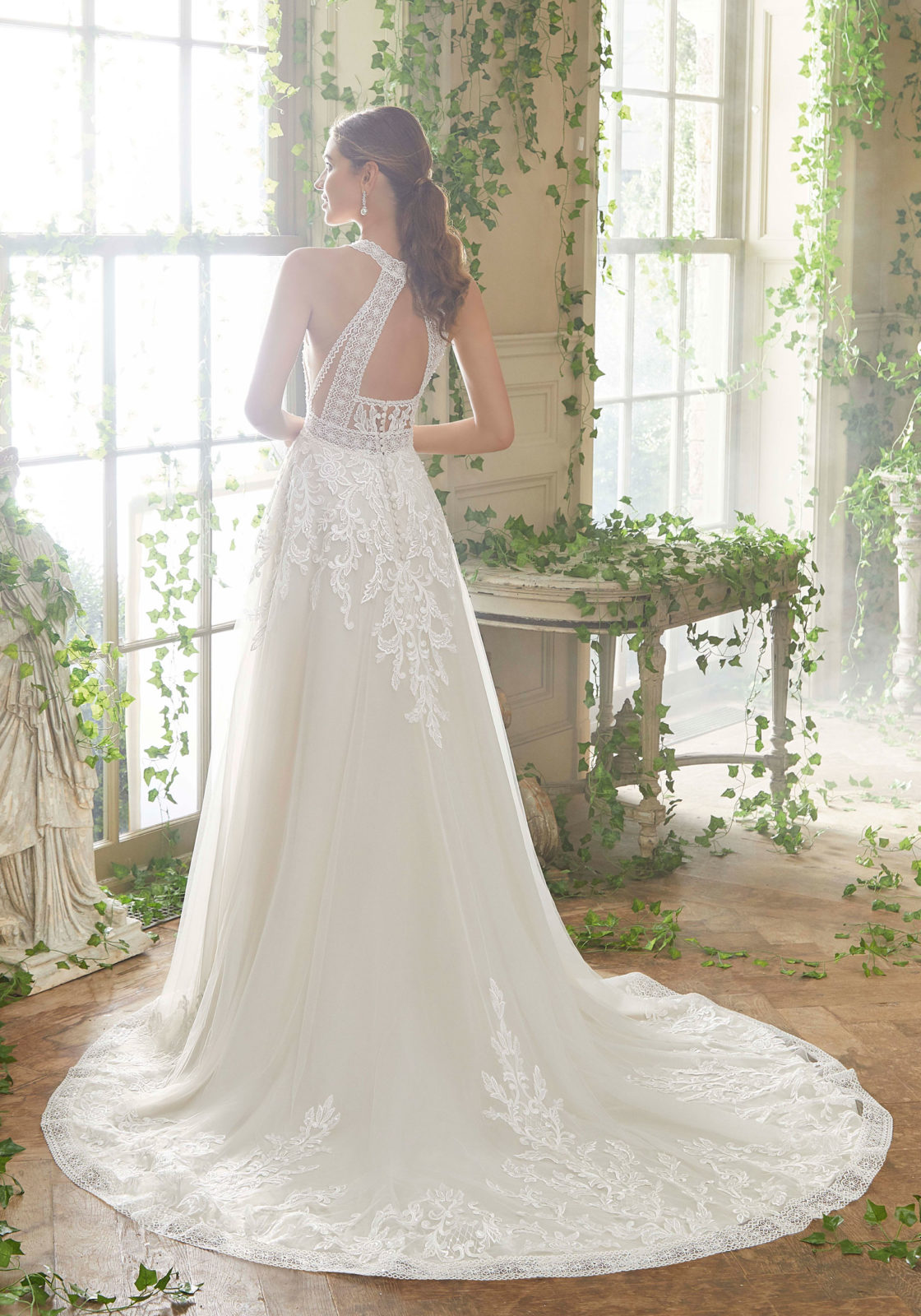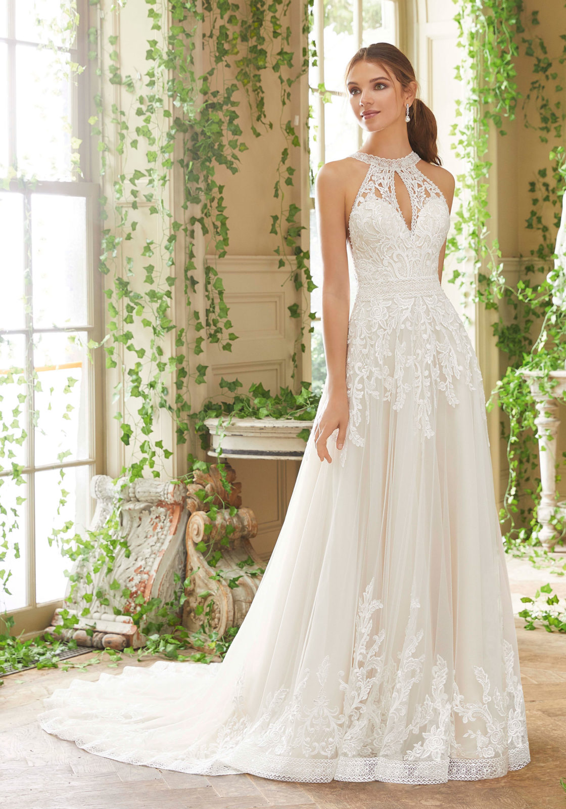 Home / Wedding Dresses / Morilee Wedding Dresses / Blu Collection Wedding Dresses / 5708 PoppyFrosted, Embroidered Appliqués with Delicate, Pearlized Beading for the Neckline and Waistline Detail on a Soft Tulle A-Line Gown with Floral Hemline Border. Available in Three Lengths: 55″, 58″, 61″. Shown in ivory/champagne
