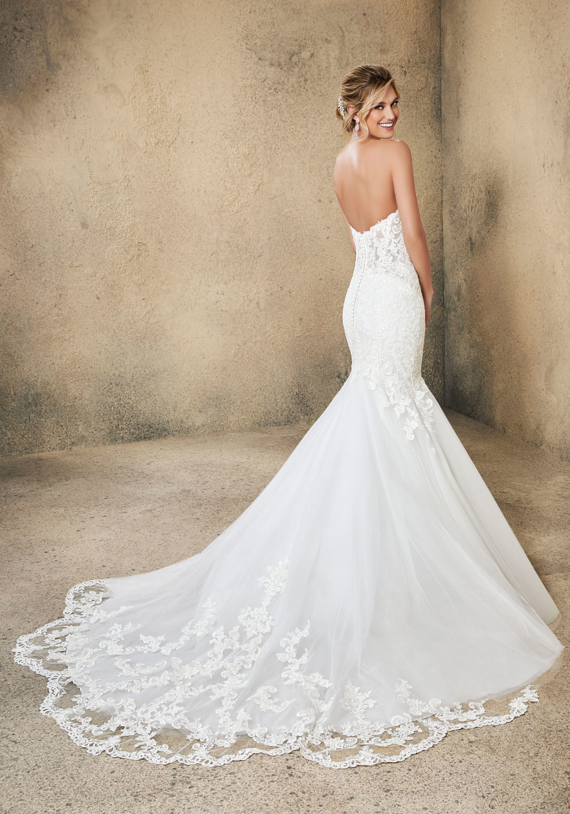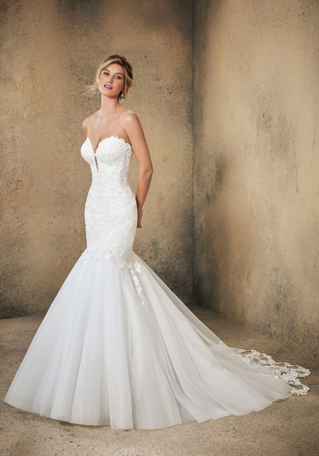 Home / Wedding Dresses / Morilee Wedding Dresses / Blu Collection Wedding Dresses / 5771 RenataShown in ivory, this strapless Renata designer wedding dress features frosted alençon lace appliqués on a tulle mermaid gown with a scalloped train. Available in white and ivory, the sweetheart neckline complements the mermaid silhouette of this designer wedding dress. The buttons along the back of the dress complete the look.